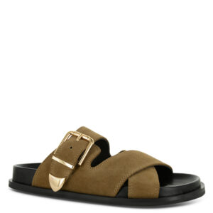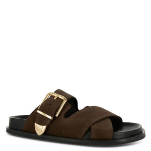 short_d:Ebony matte kid strappy sandal, featuring a slip-on design, open-toe, and a fluffy faux shearling footbed. Ebony Matte Kid with Ebony Faux Shearling Leather Upper Leather Lining Rubber Sole Sole Height: 30mm approx.