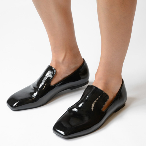 Black high shine leather loafers, featuring a slip on style and square toe.