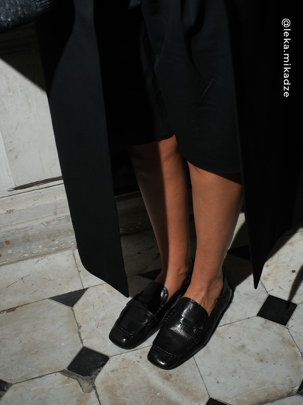 Black distressed leather loafers featuring a ruched heel and rubber sole