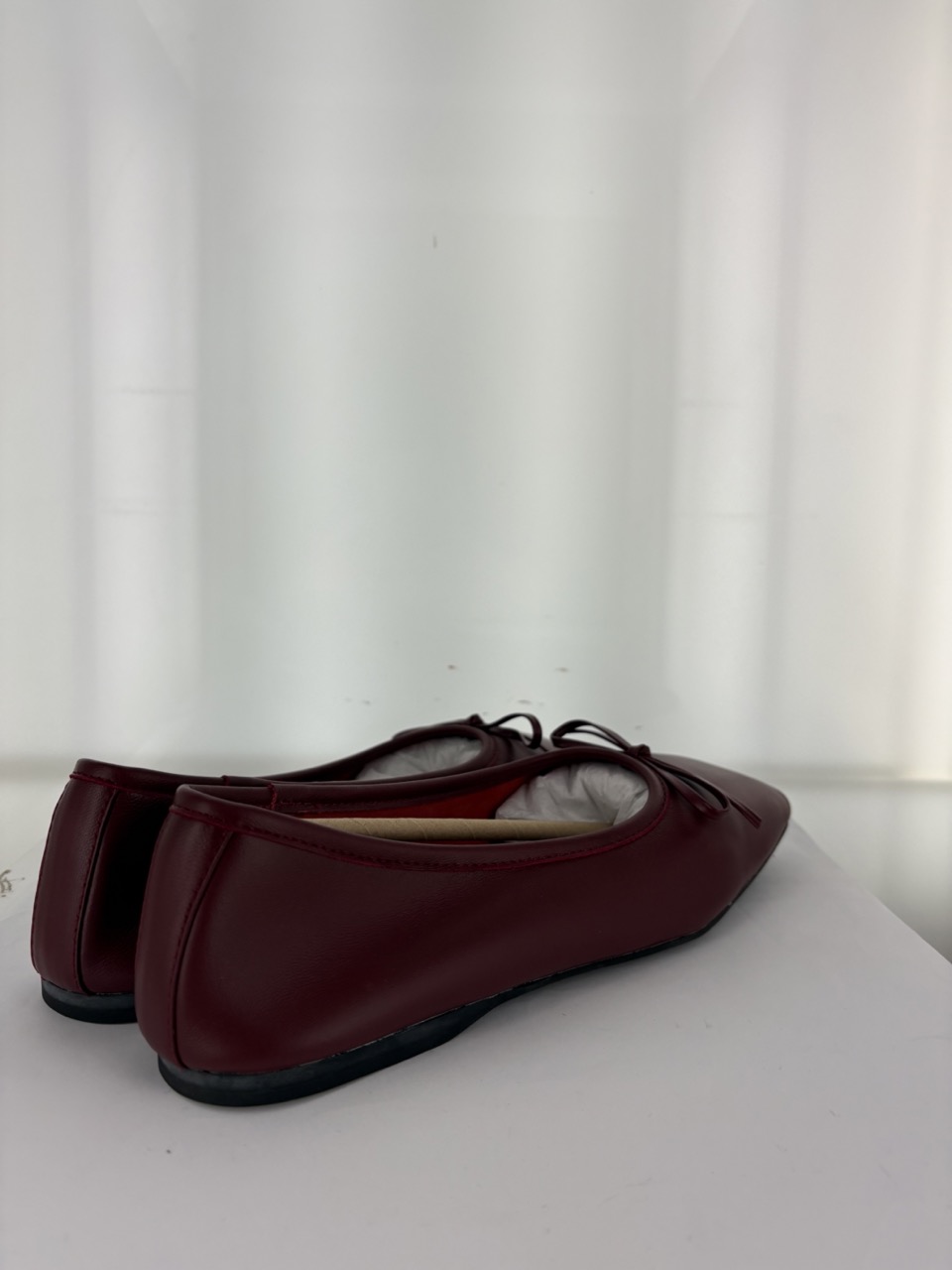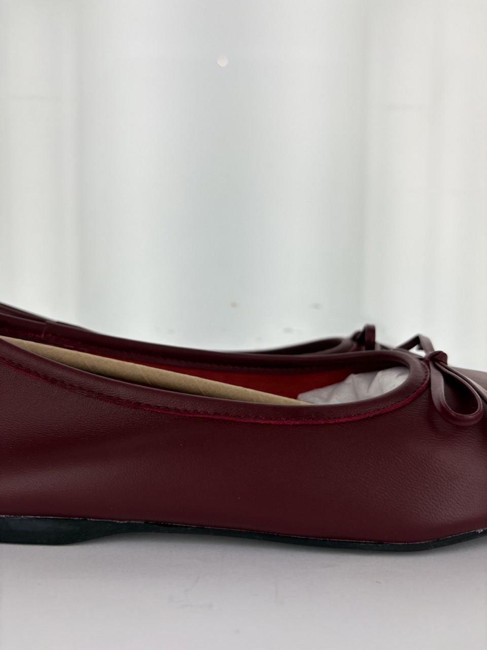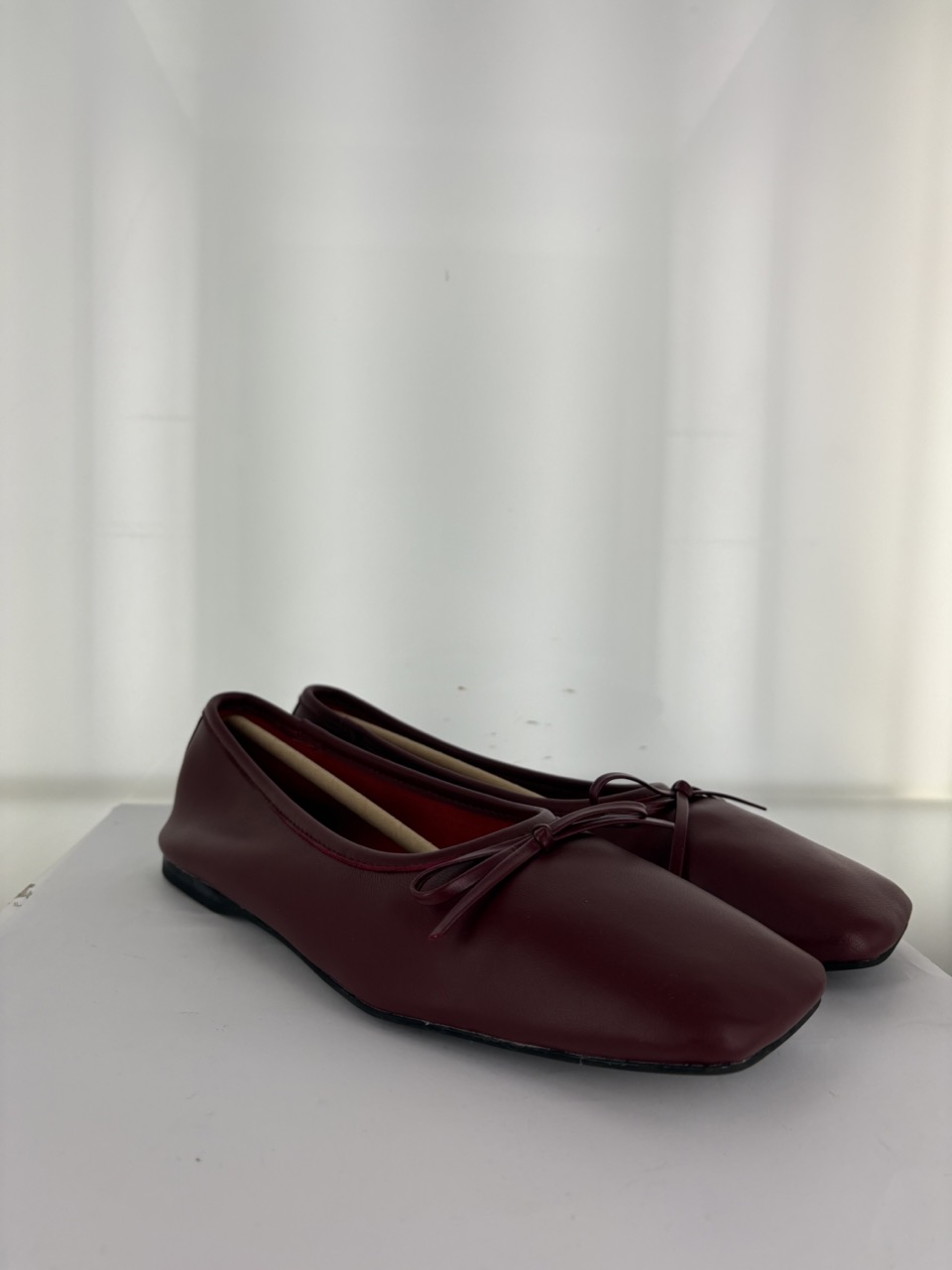 Burgundy leather ballet flat featuring a square toe and bow detail .