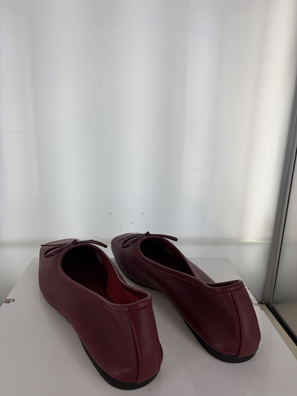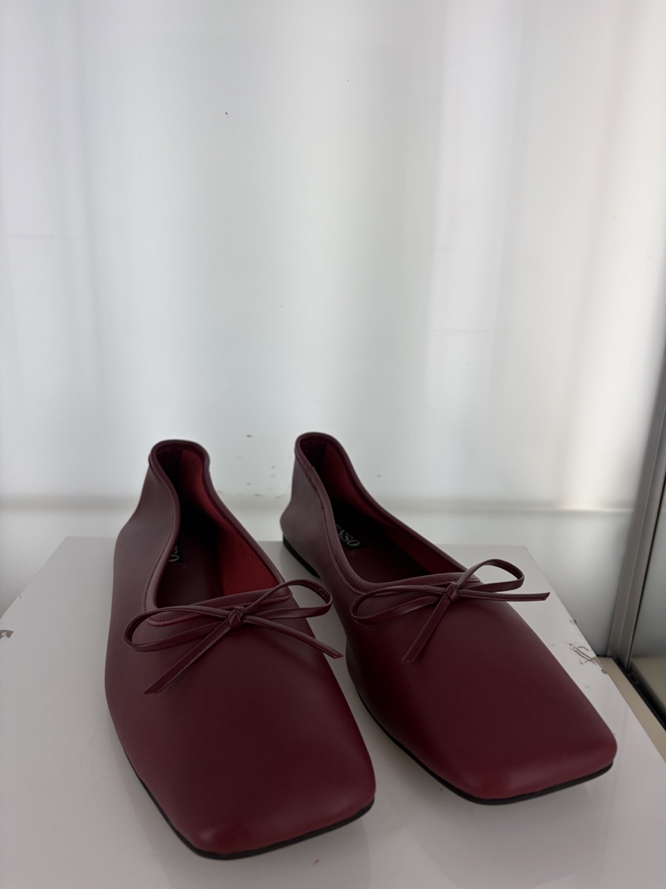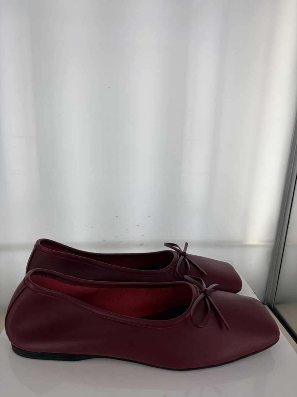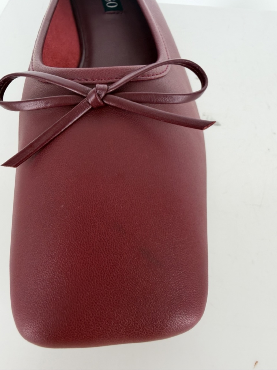 Burgundy leather ballet flat featuring a square toe and bow detail .