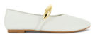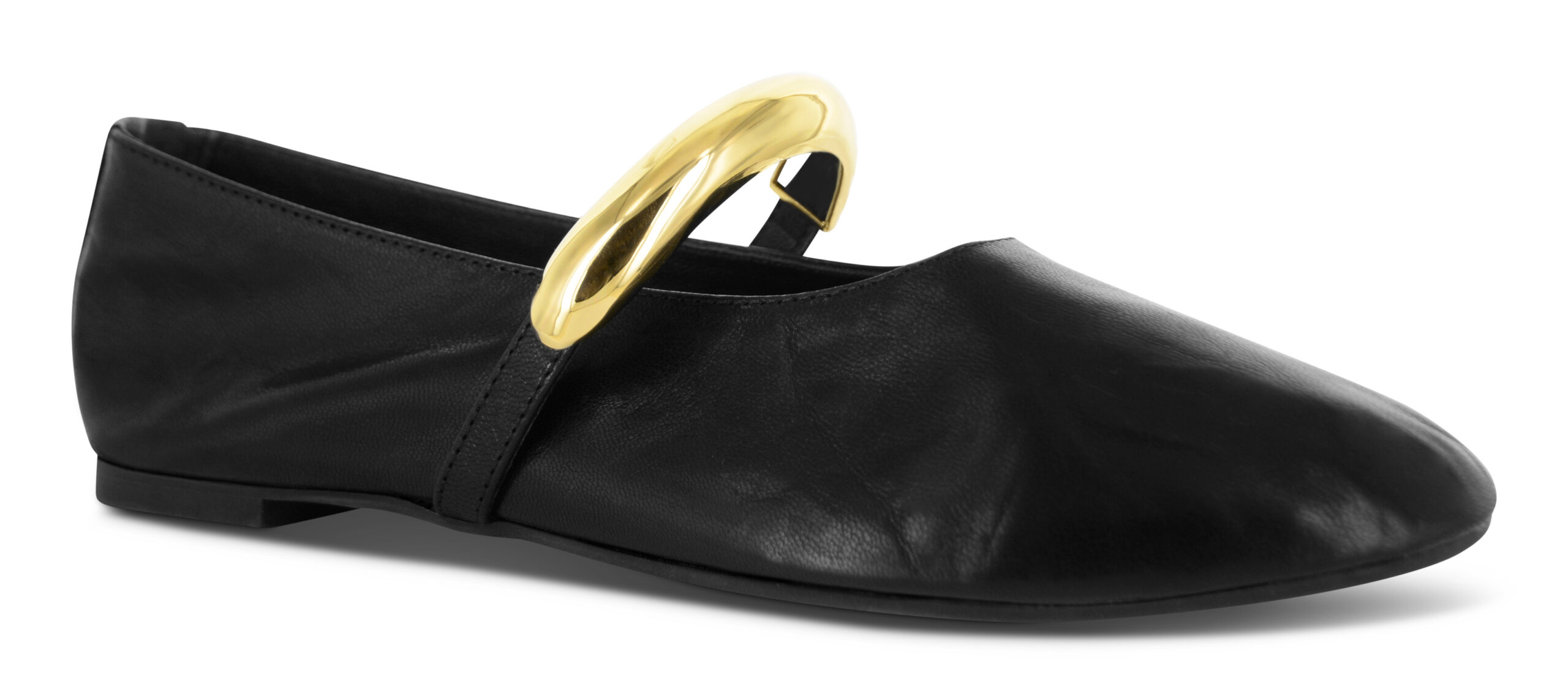 Ebony distressed kid leather ballet flat detailed with a sculptural gold metal strap and a rounded toe