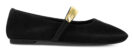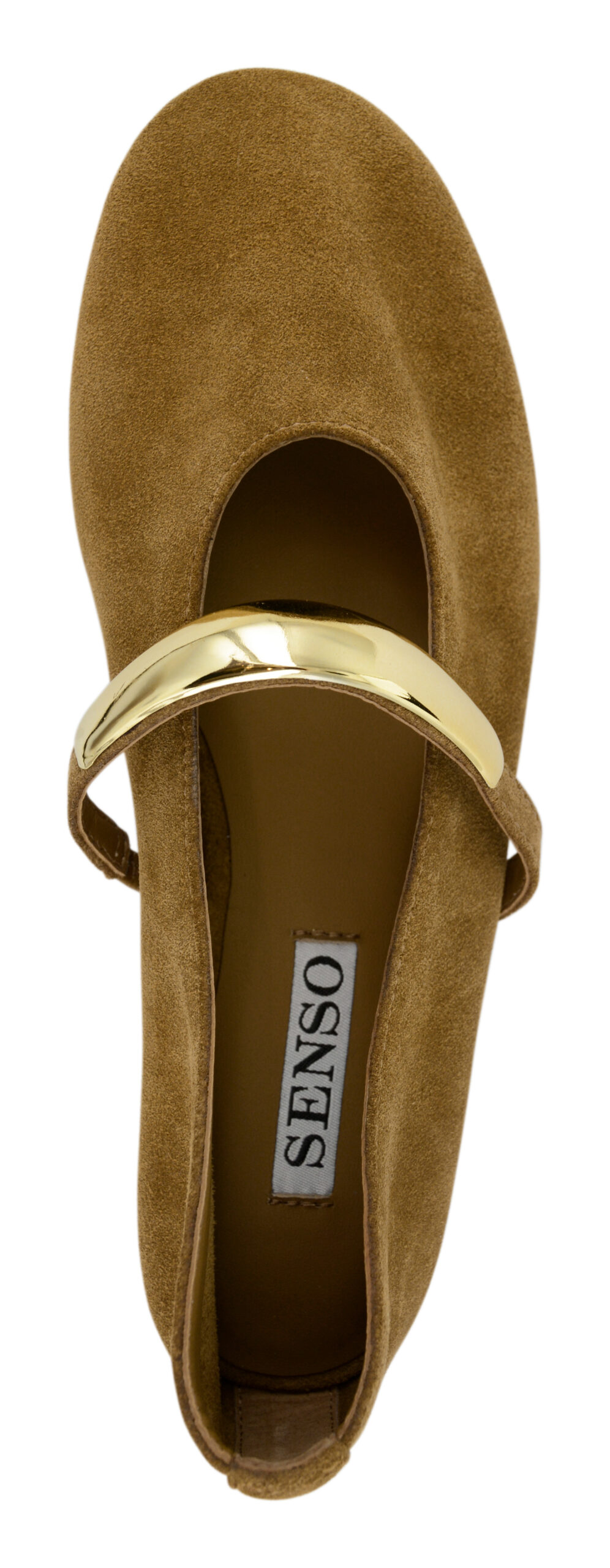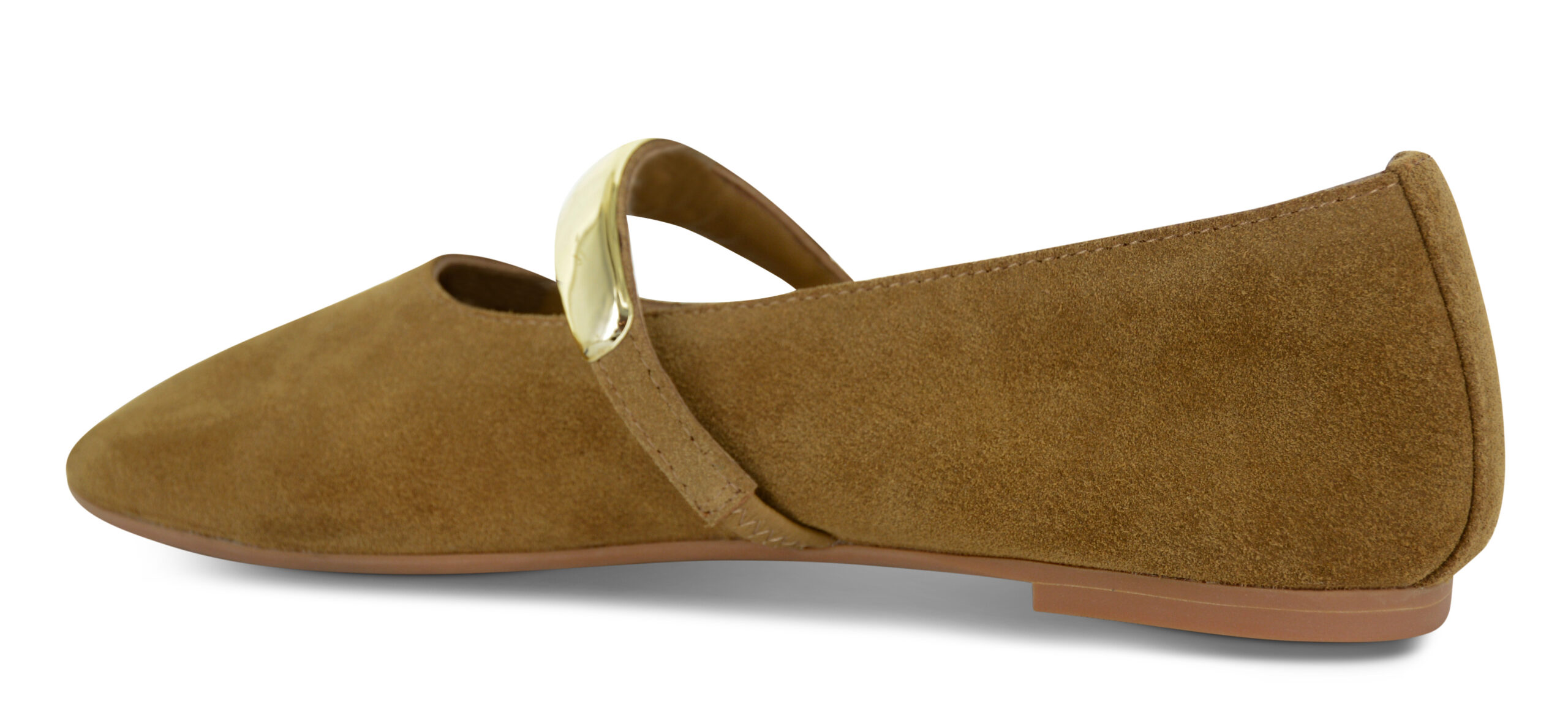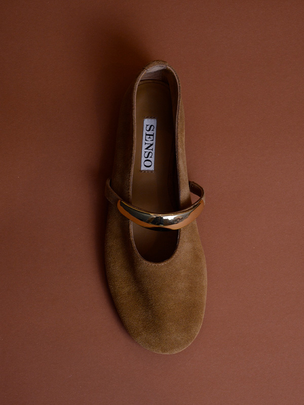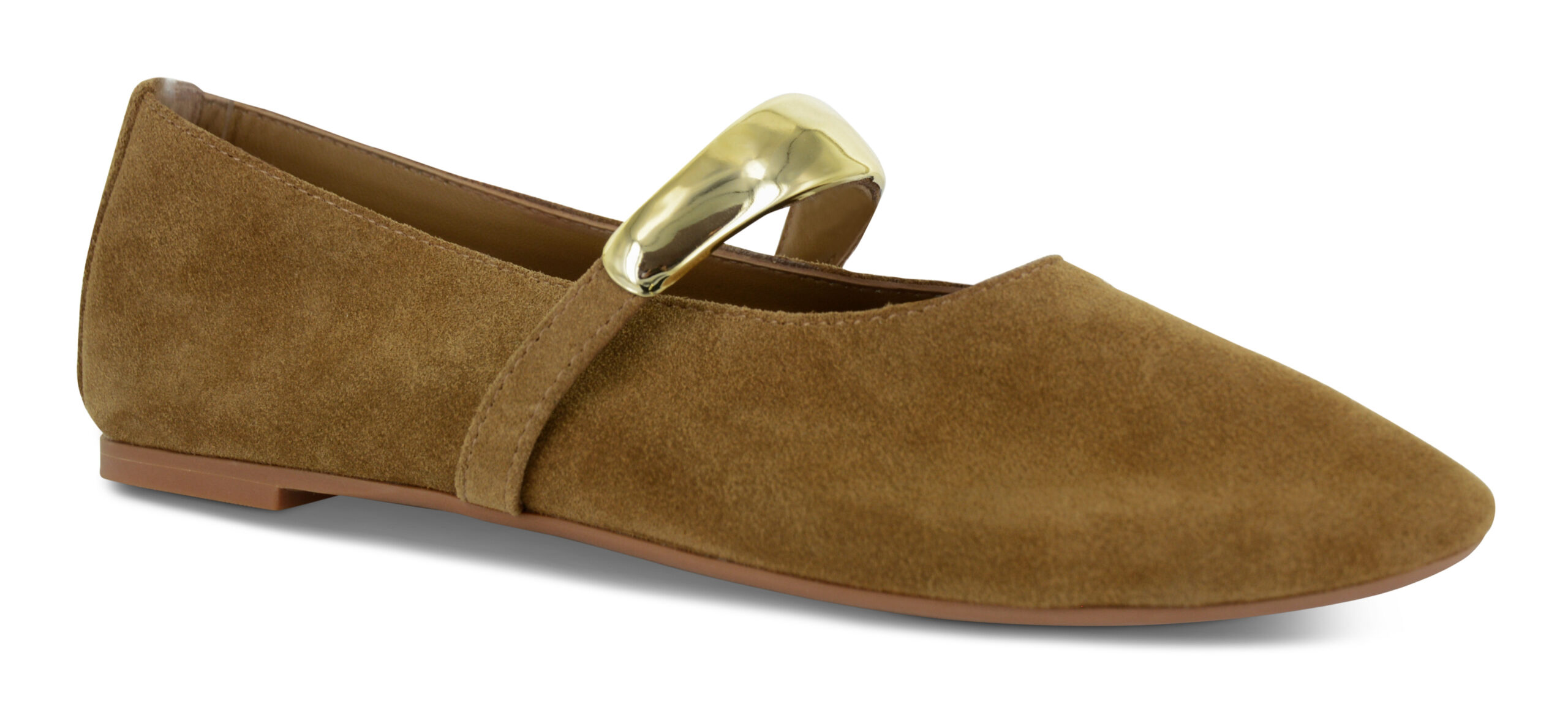 Cinnamon suede calf leather ballet flat detailed with a sculptural gold metal strap and a rounded toe