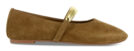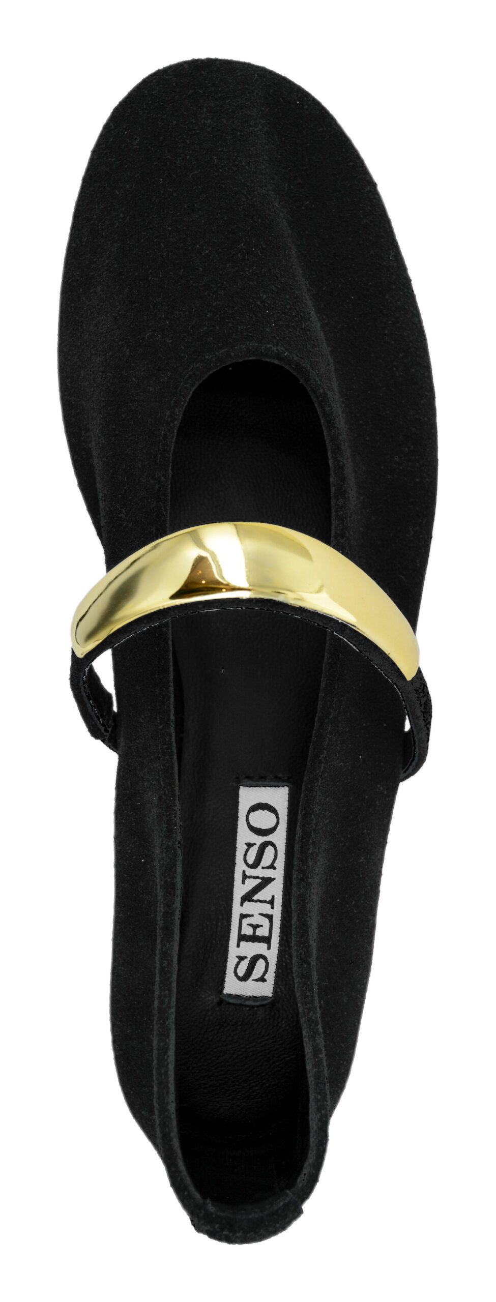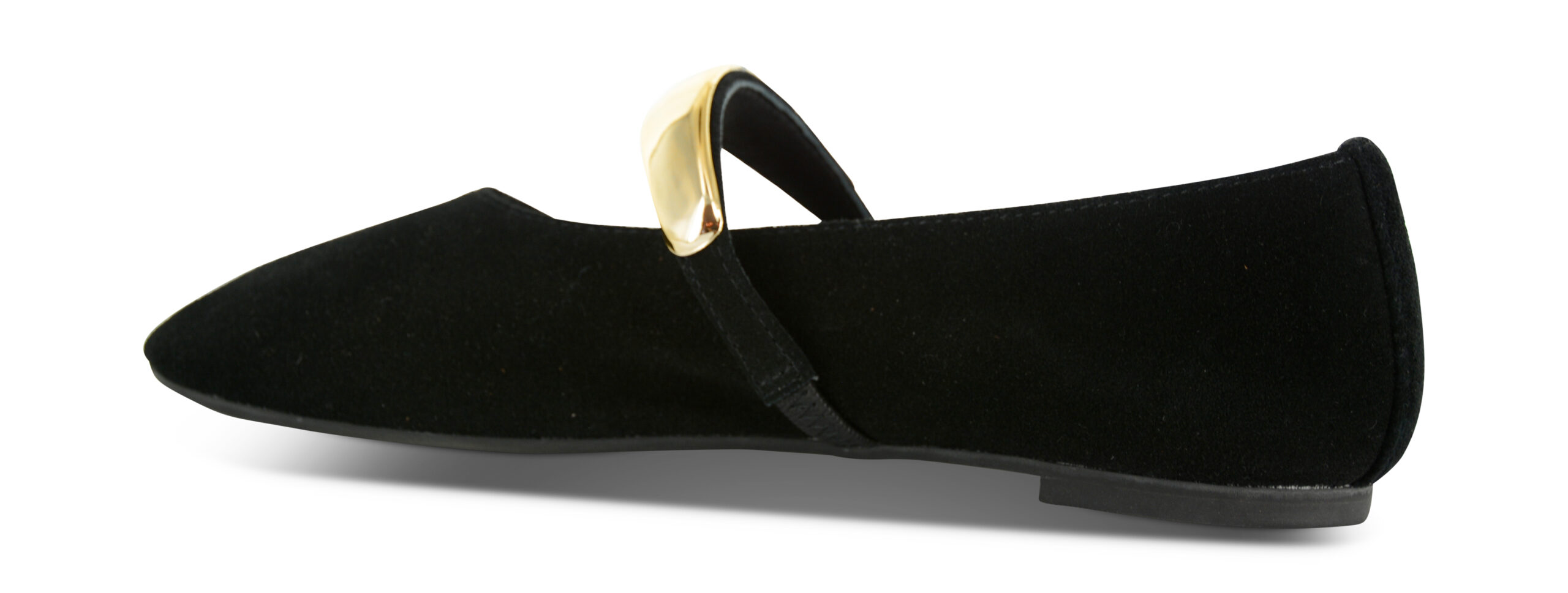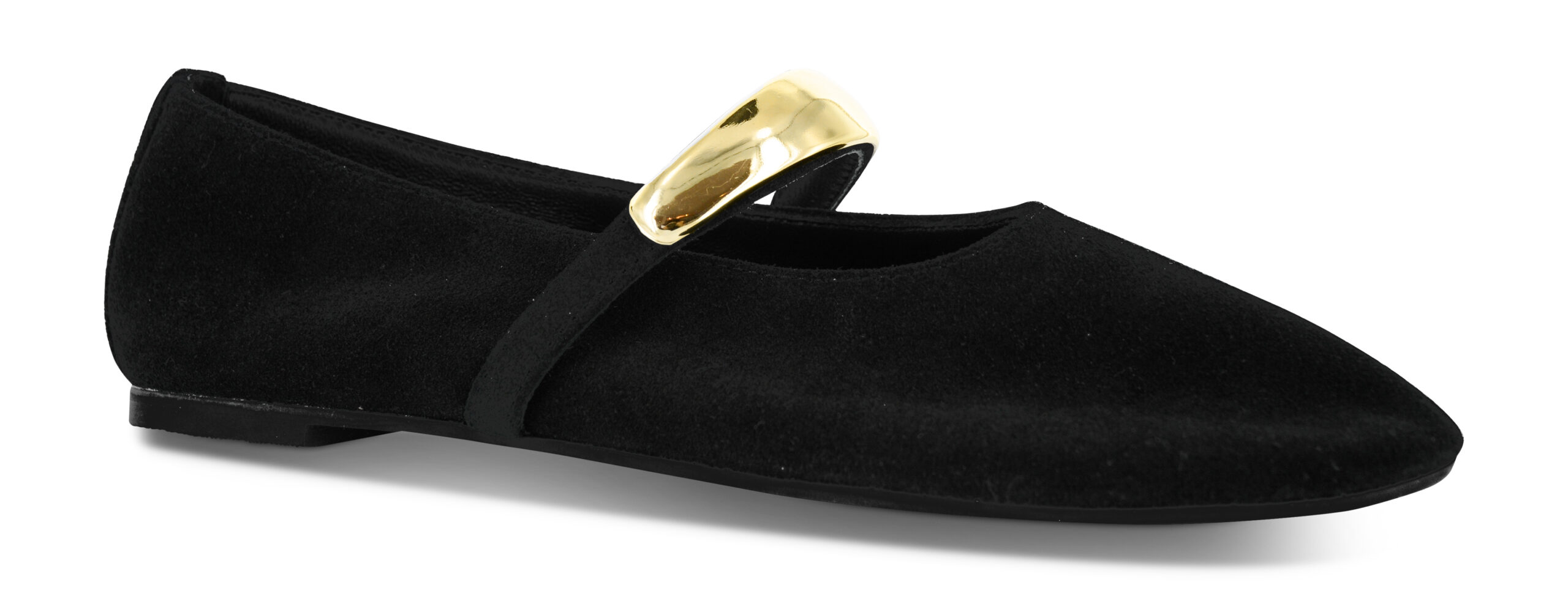 Ebony suede calf leather ballet flat detailed with a sculptural gold metal strap and a rounded toe