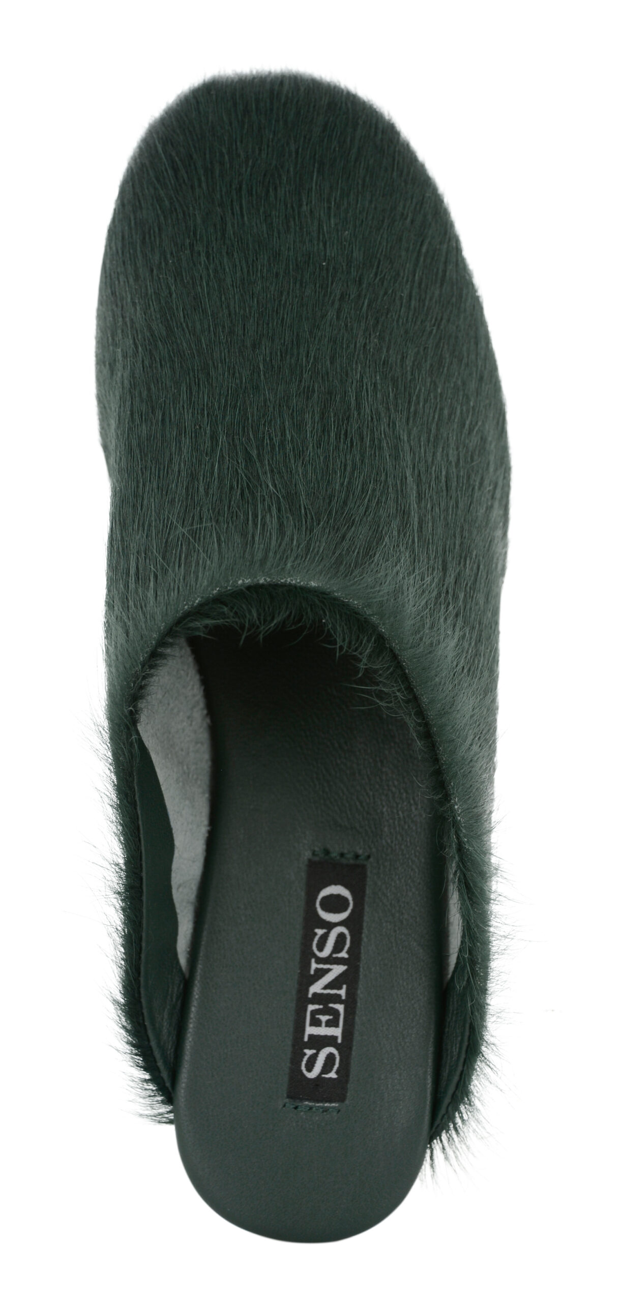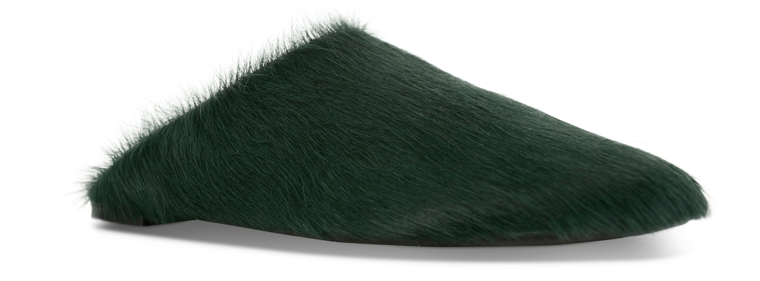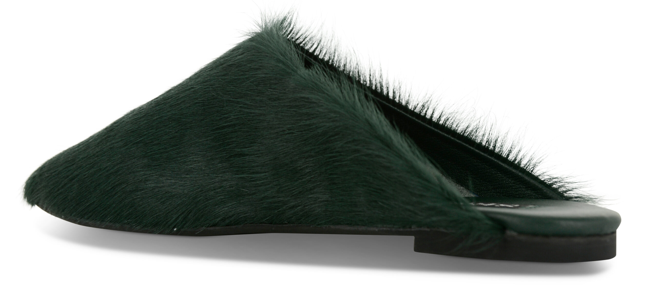 Bottle green pony hair mules designed with a sleek slip-on silhouette and a soft, textured finish.