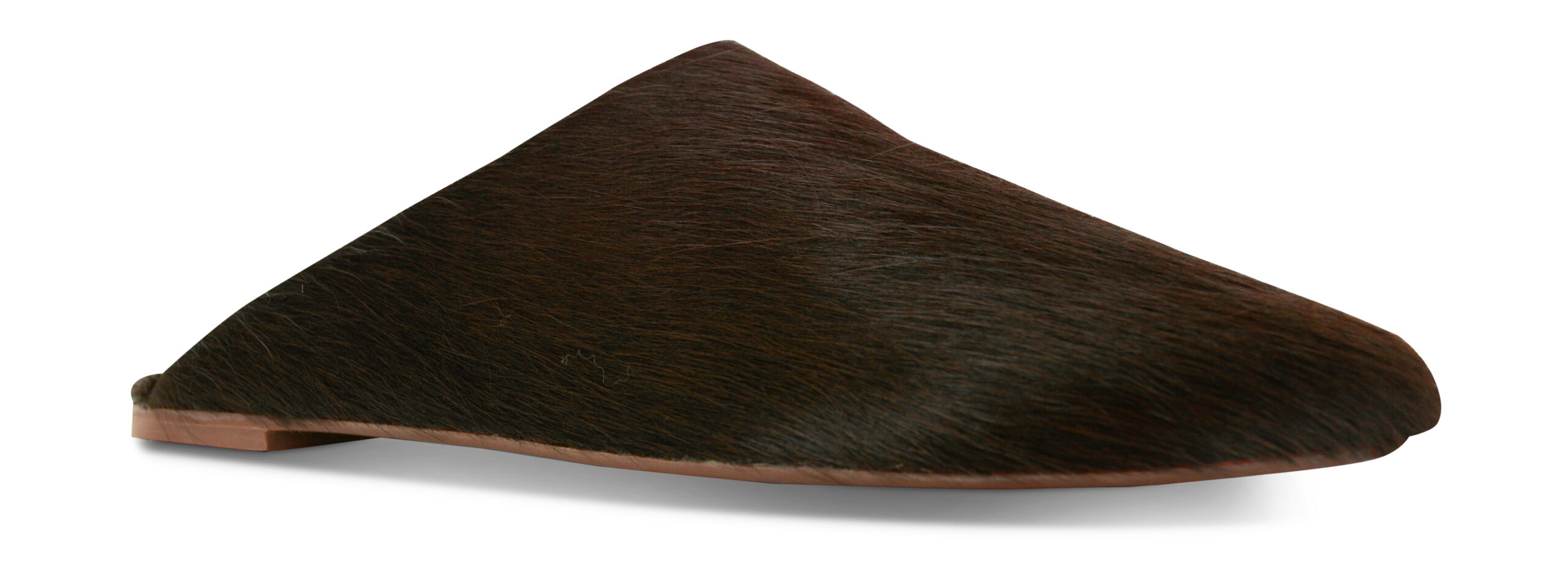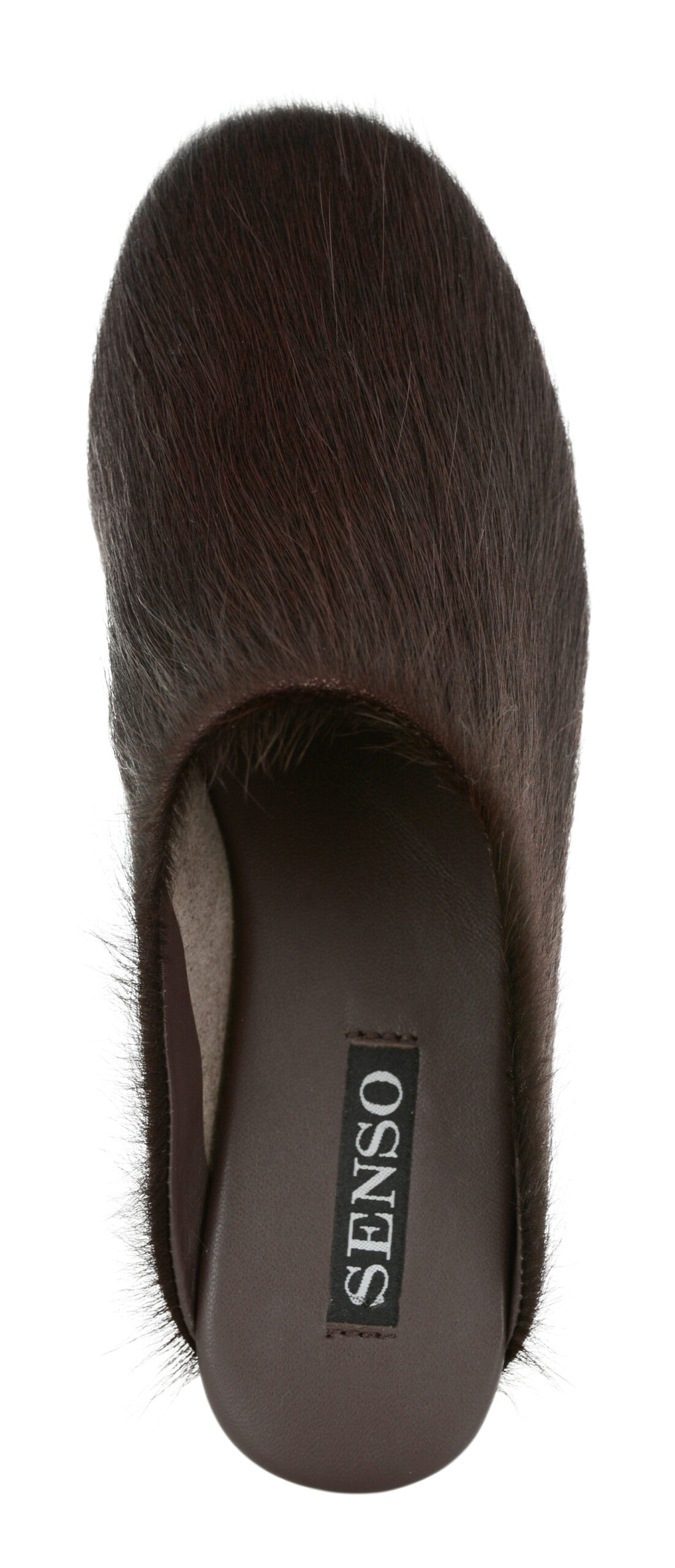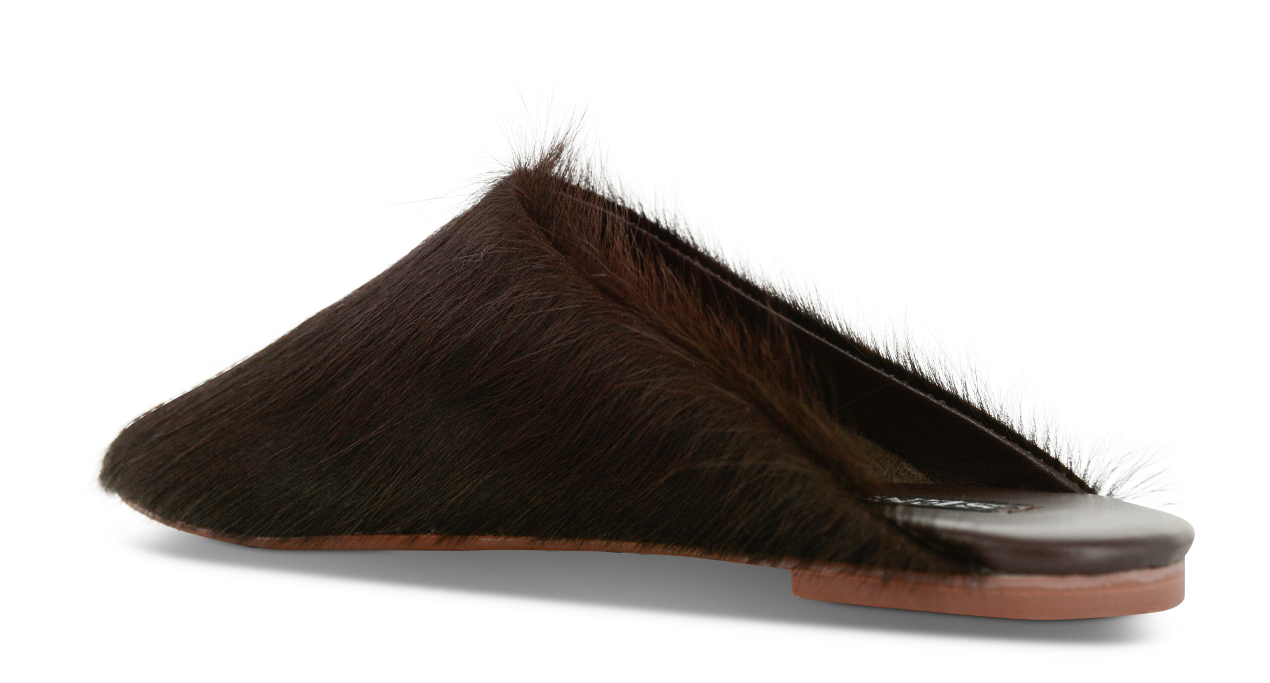 Cocoa pony hair mules designed with a sleek slip-on silhouette and a soft, textured finish.