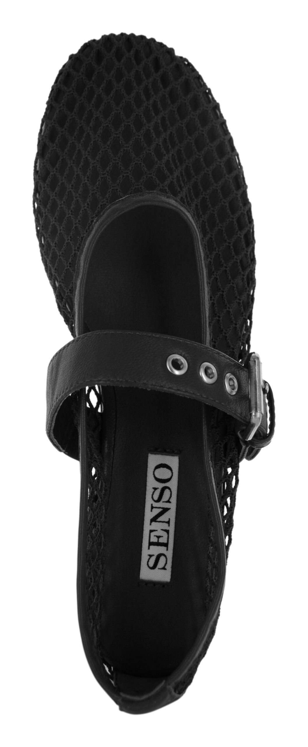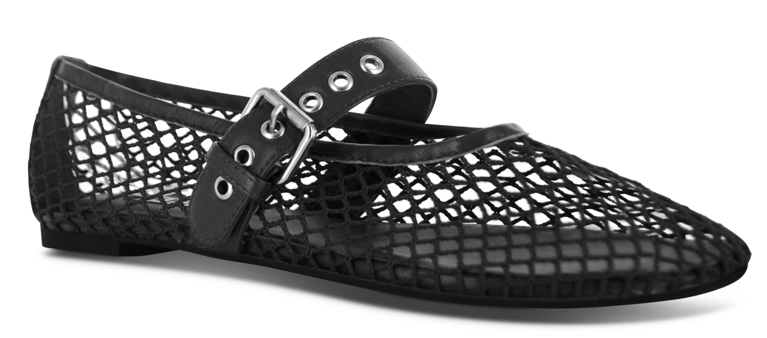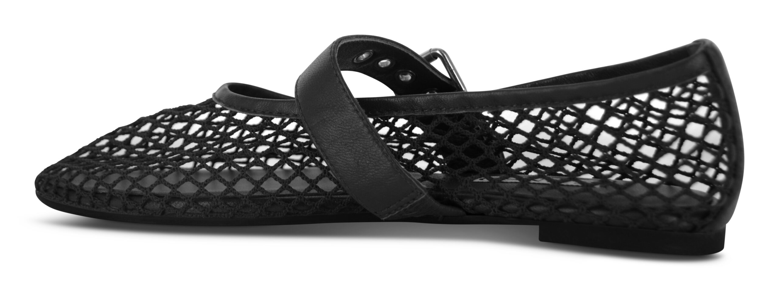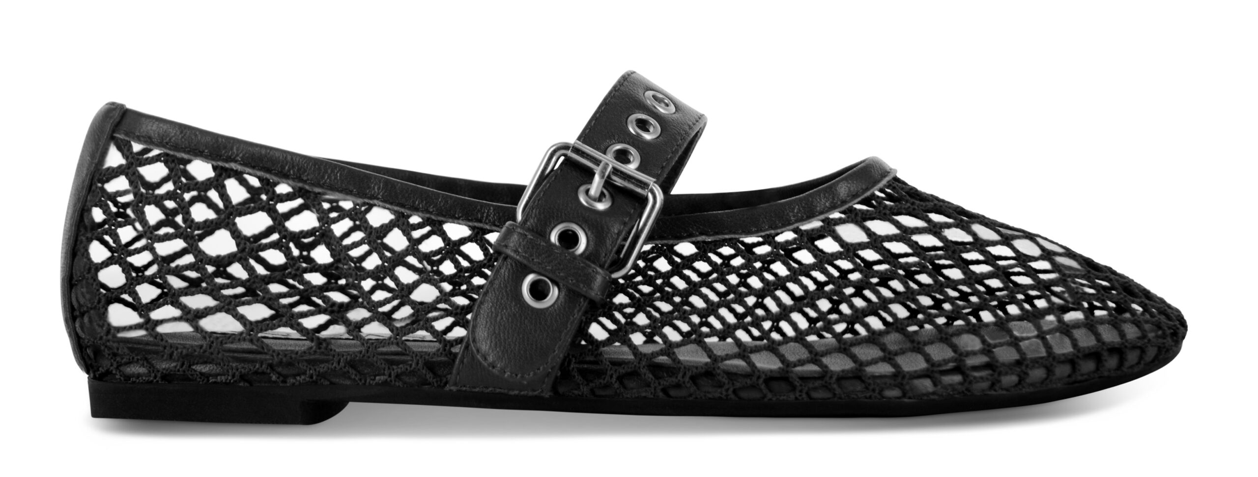 Ebony netted ballet flat featuring a strap with silver-tone hardware and a round toe