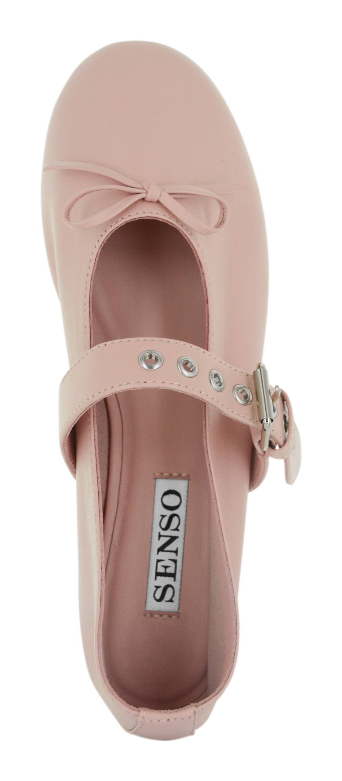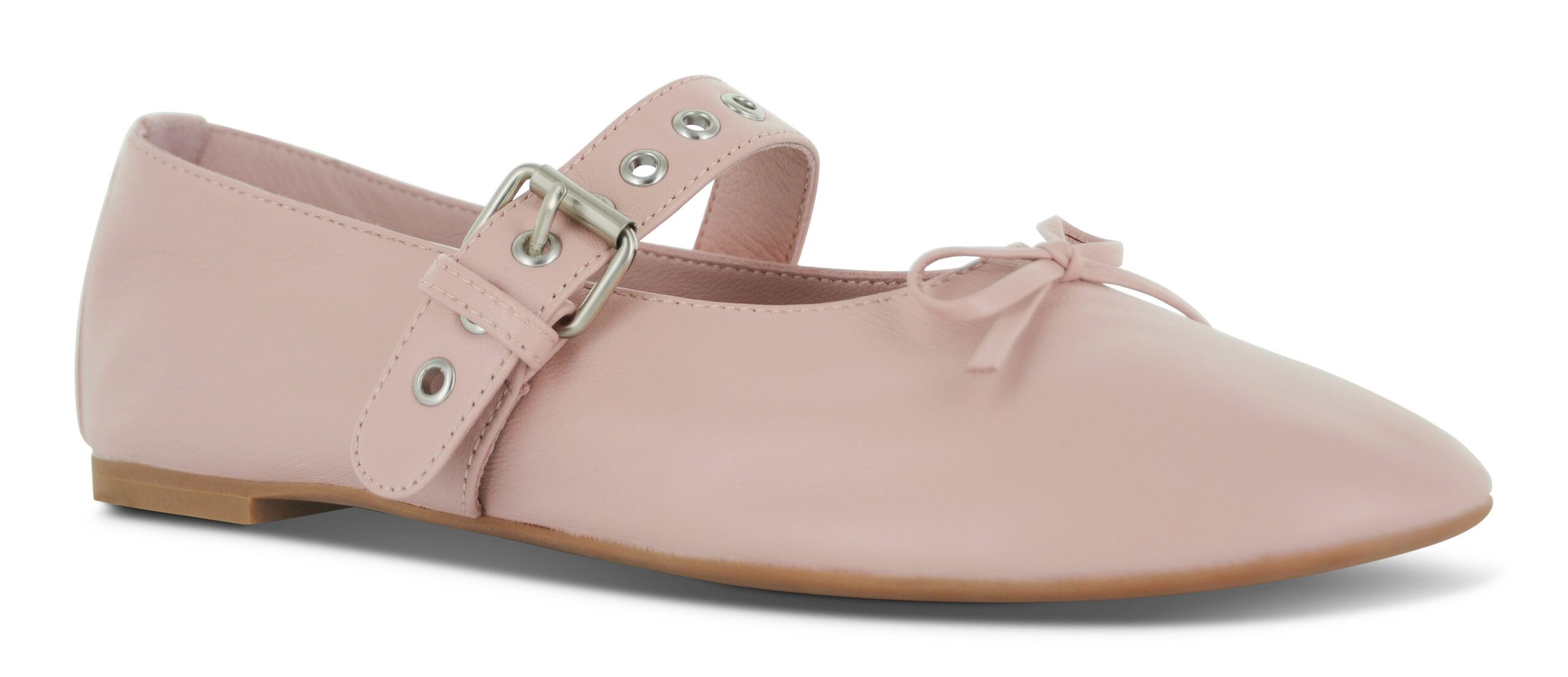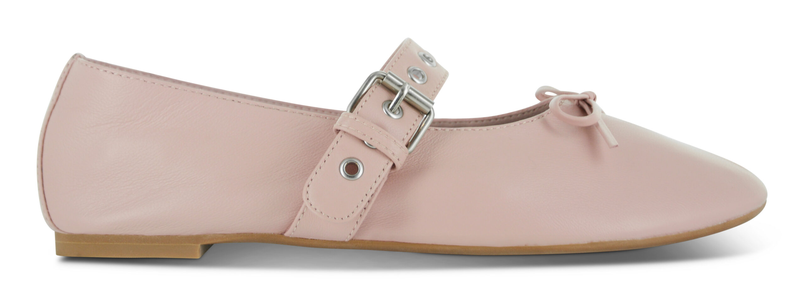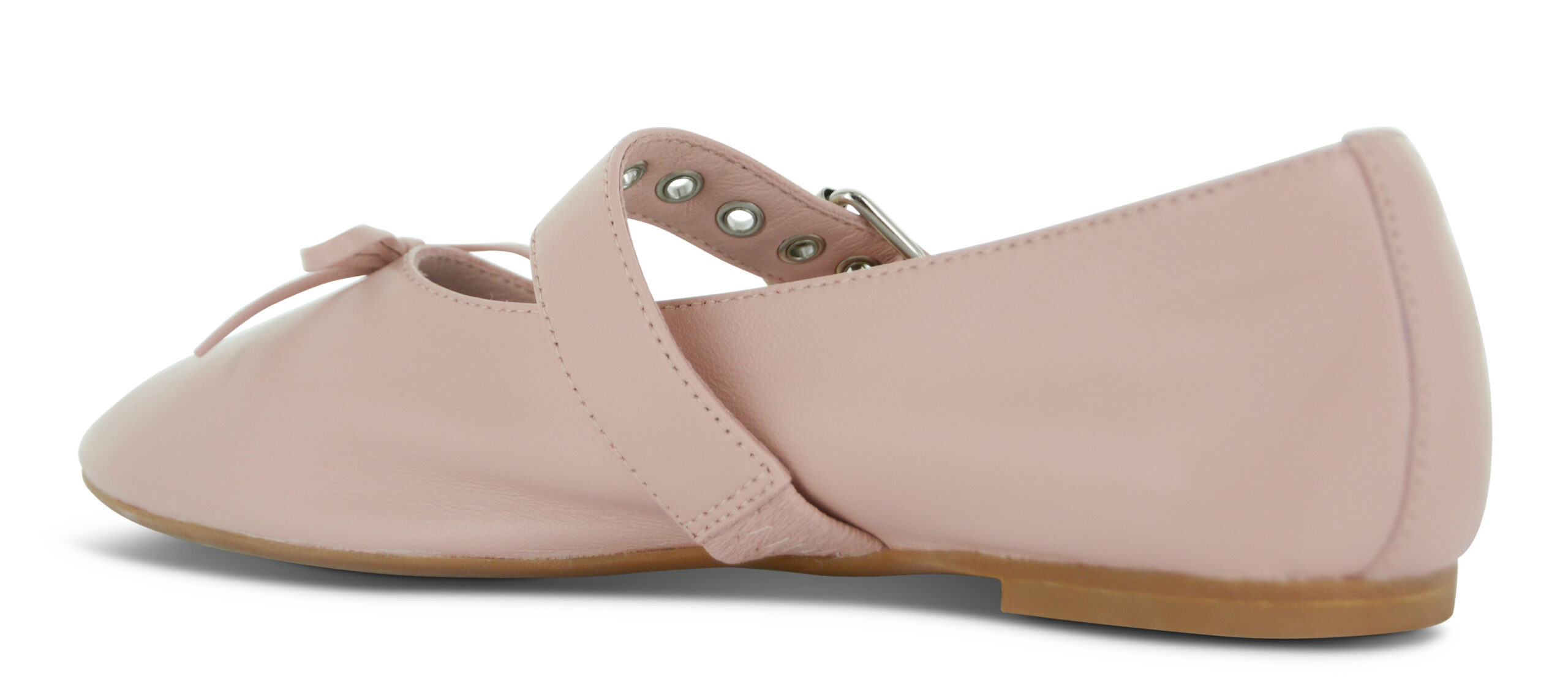 Blossom kid leather ballet flat featuring an adjustable buckle strap, bow detail, and rounded toe
