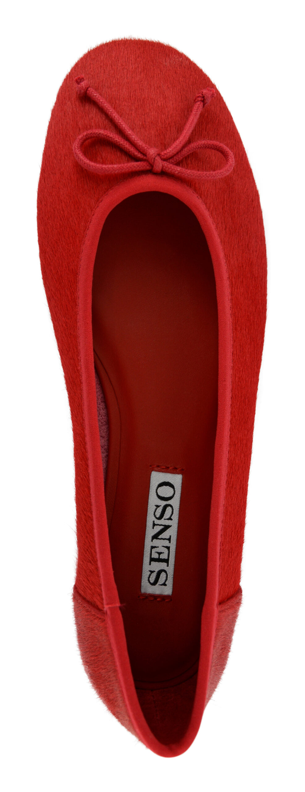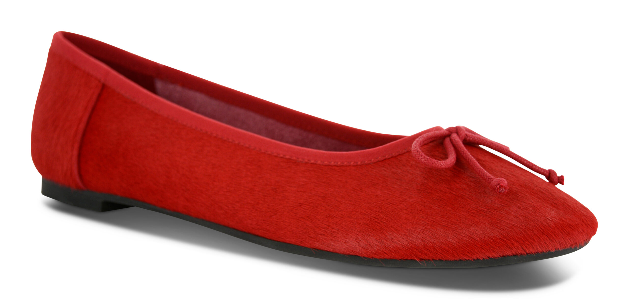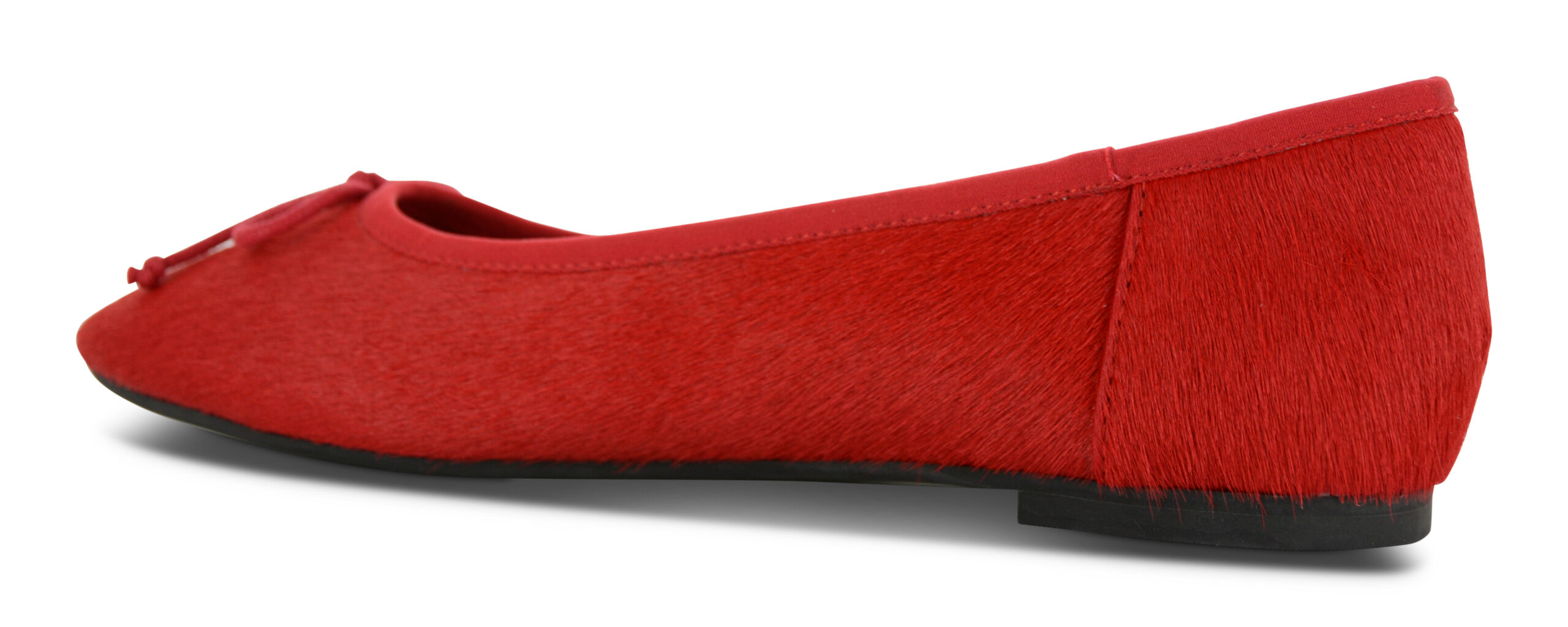 Poppy red pony hair ballet flat, featuring a delicate bow detail and a rounded toe