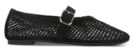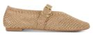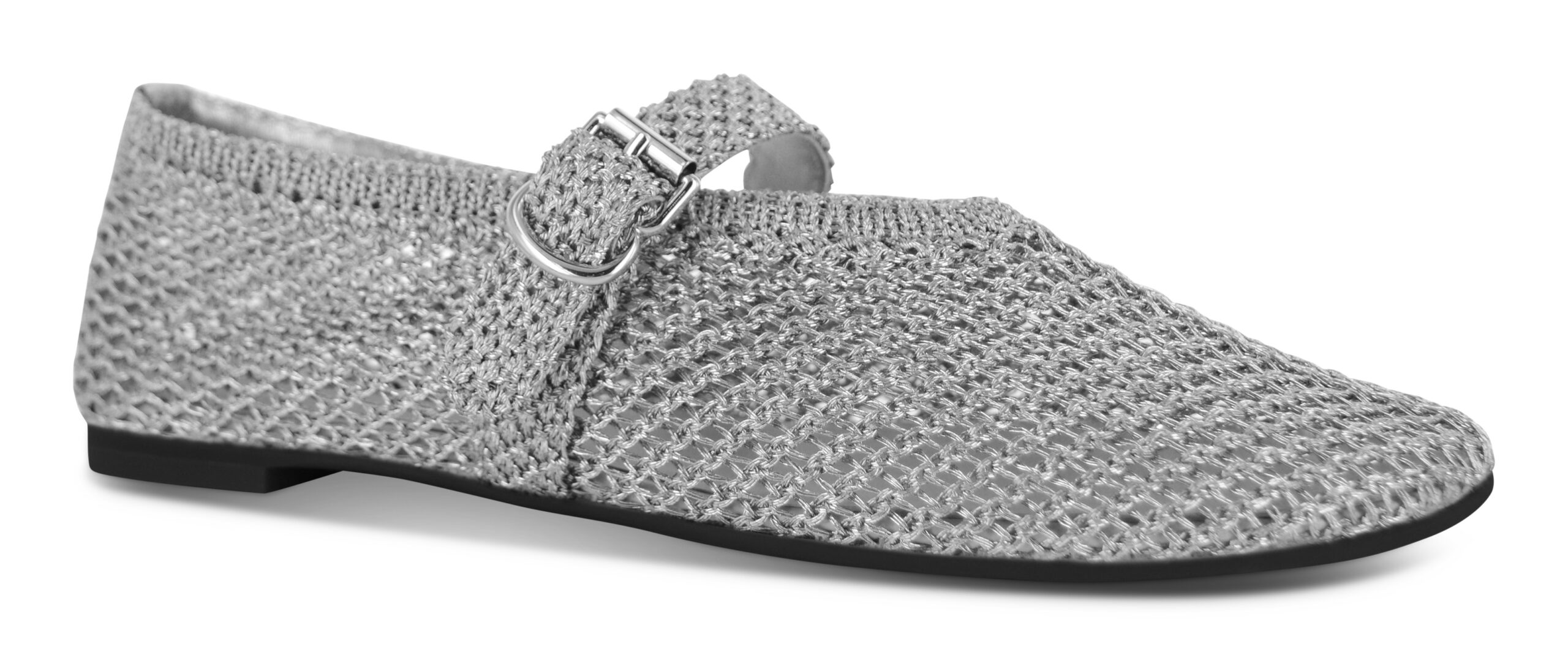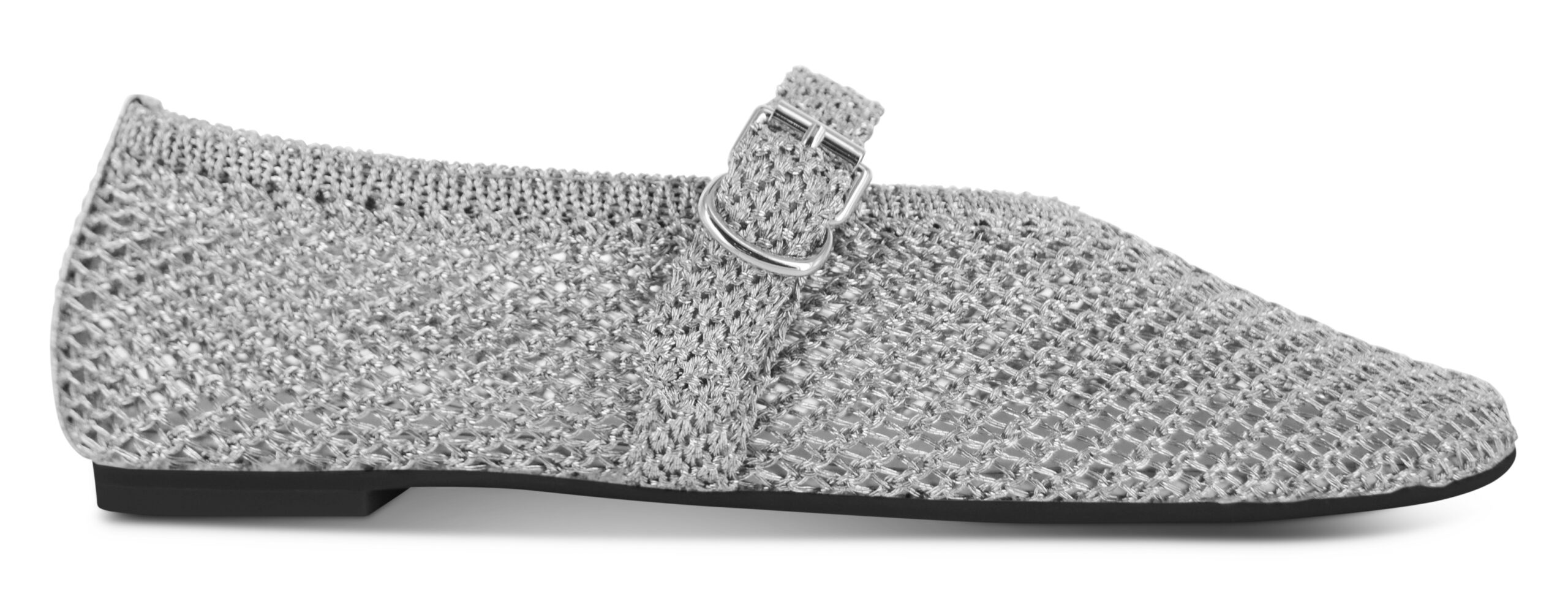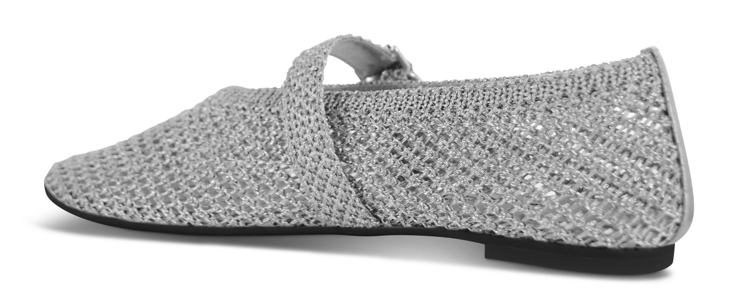 Silver metallic crochet ballet flat featuring an adjustable strap with gold-tone hardware and a softly rounded toe