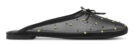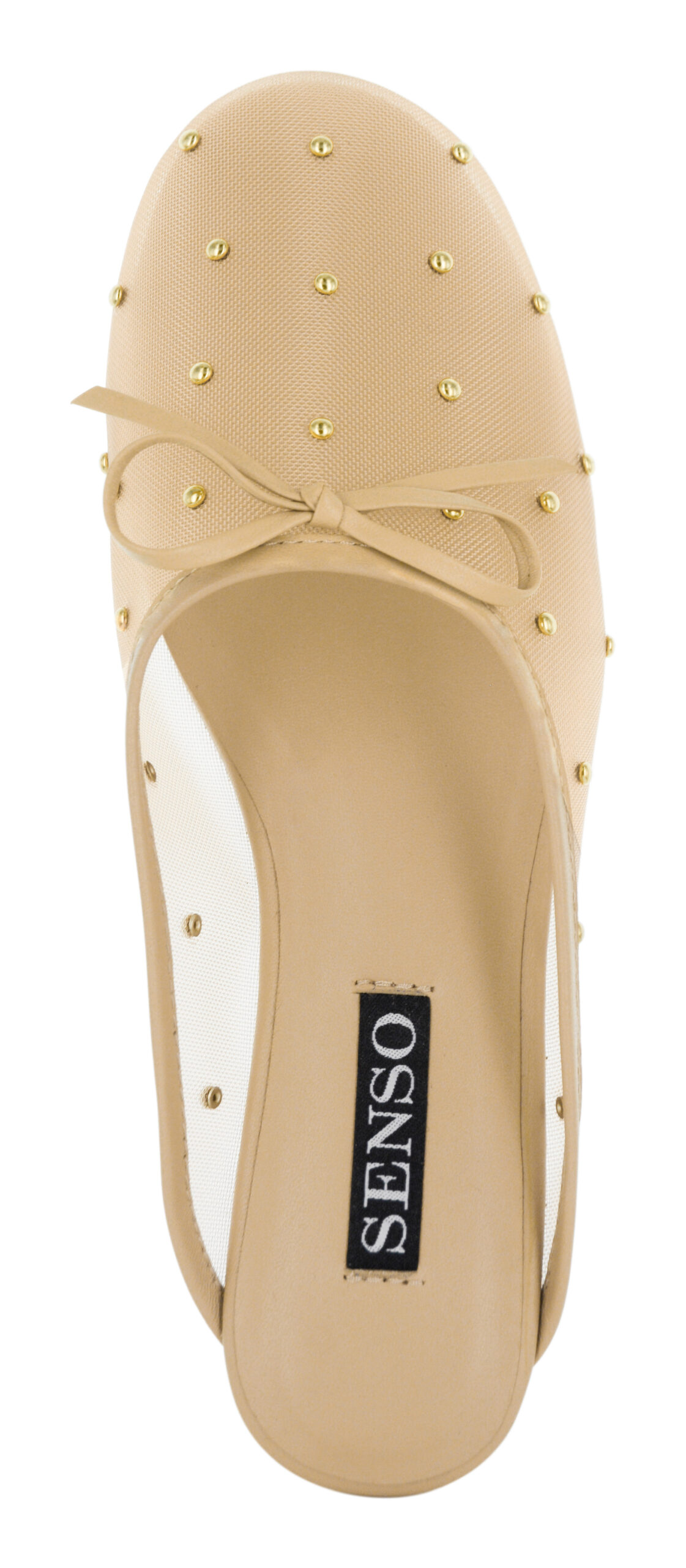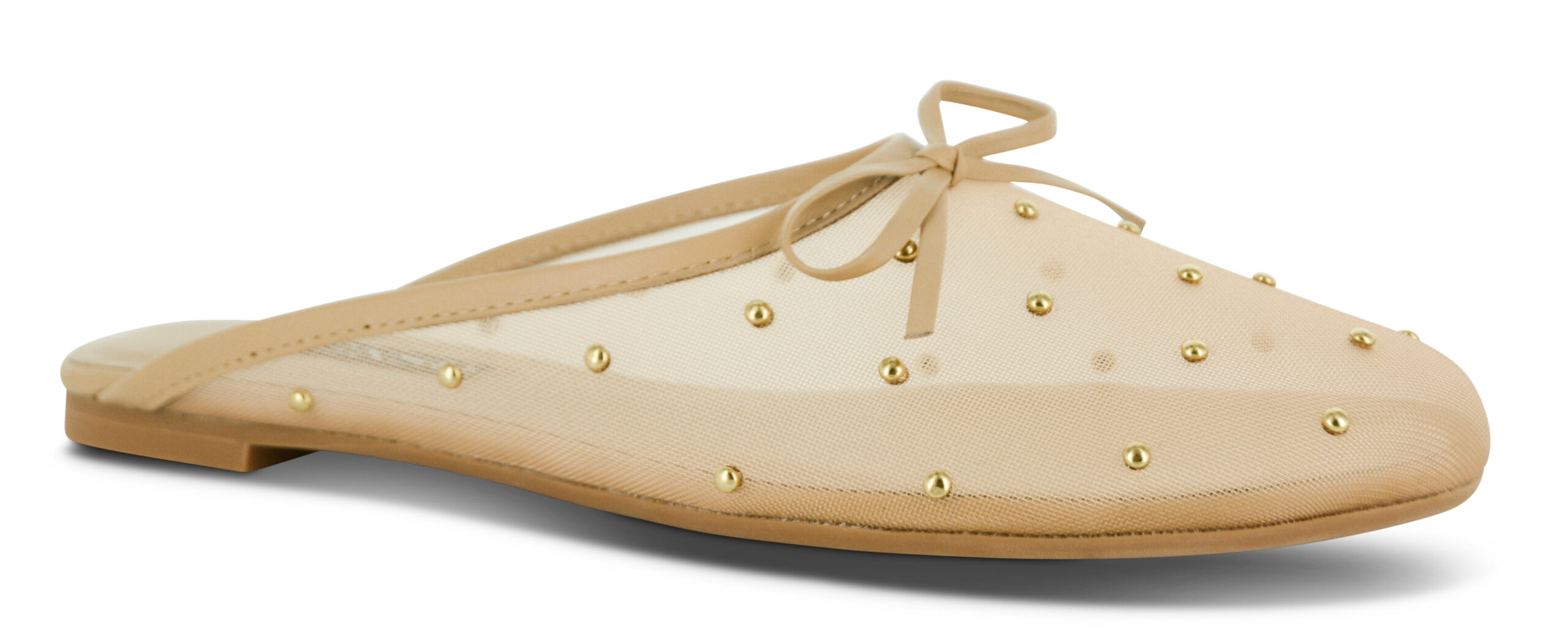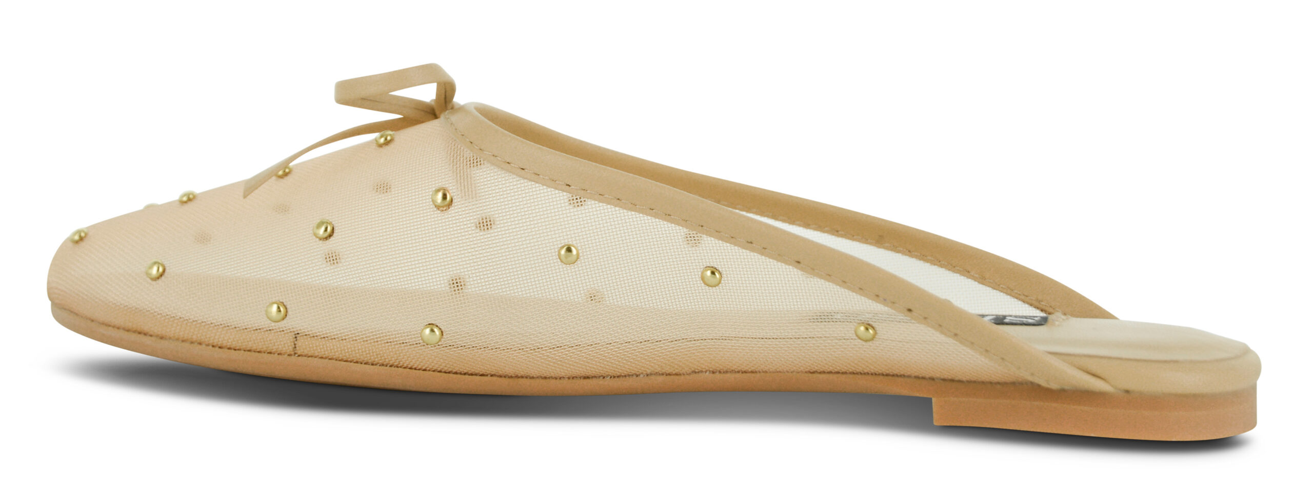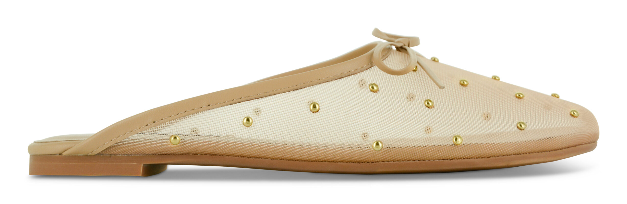 Sand mesh slip-on ballet flats featuring gold-tone stud embellishments and a bow detail, finished with a durable rubber sole