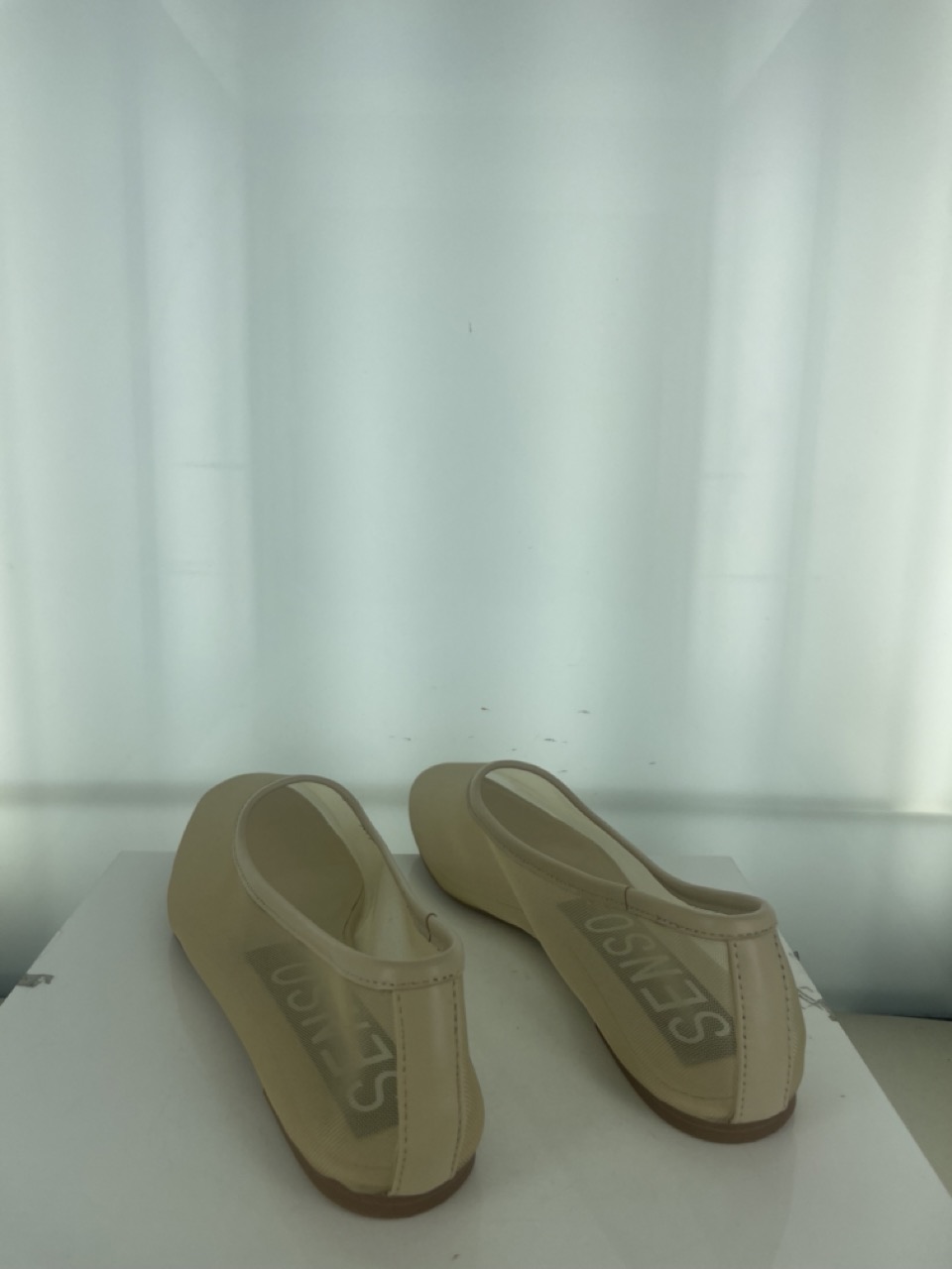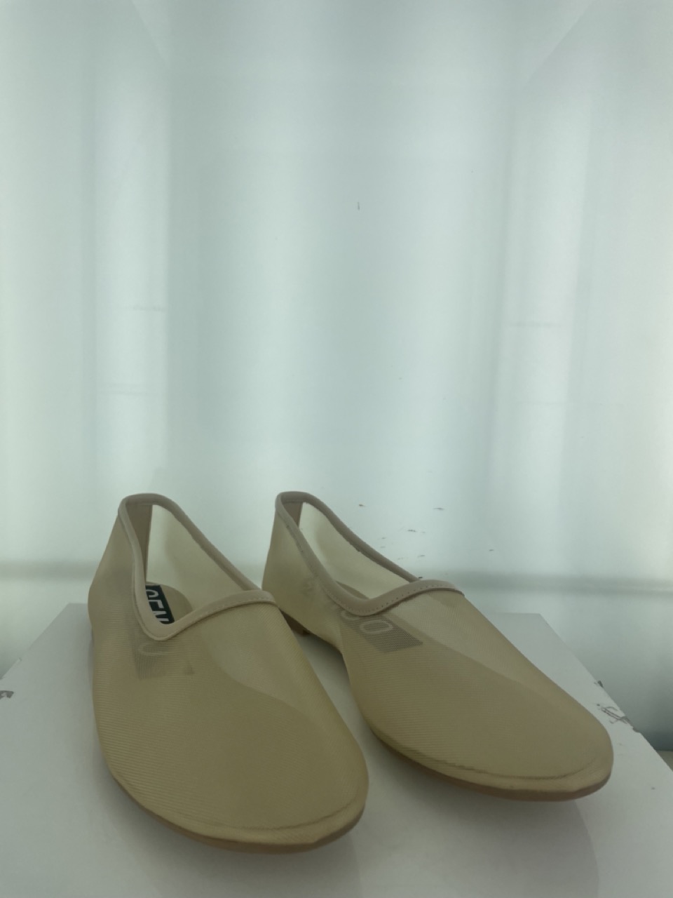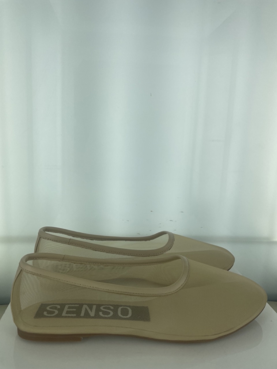 Nude mesh ballet flat featuring a round toe with leather piping