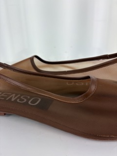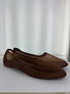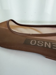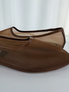 Brown mesh ballet flat featuring a round toe with leather piping