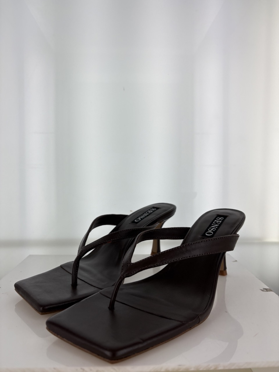 Mocha kid leather heels featuring a slip-on style, and square toe