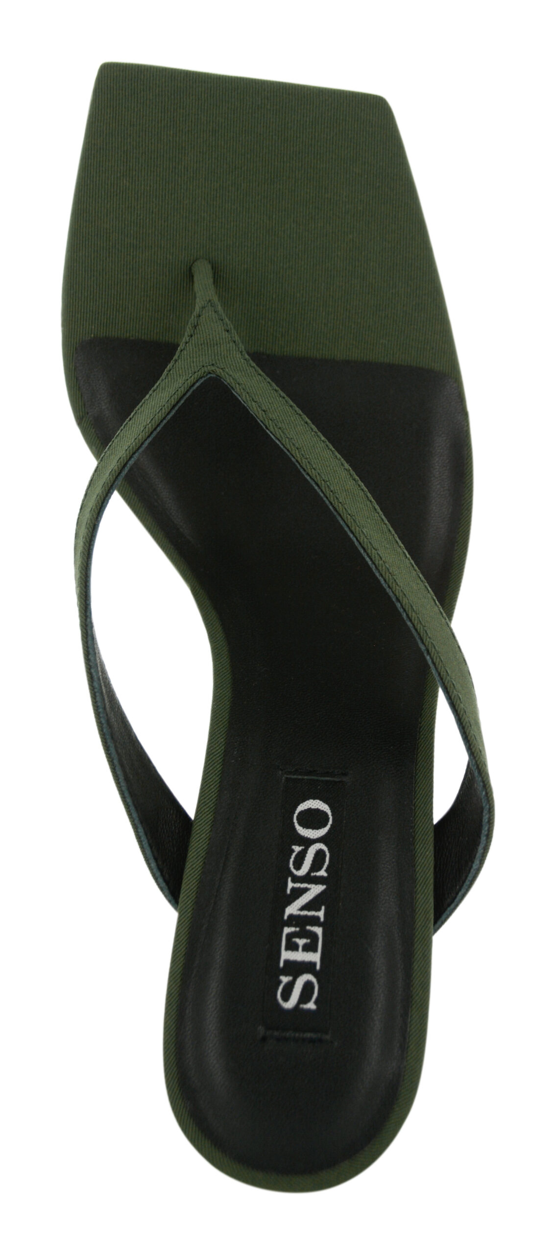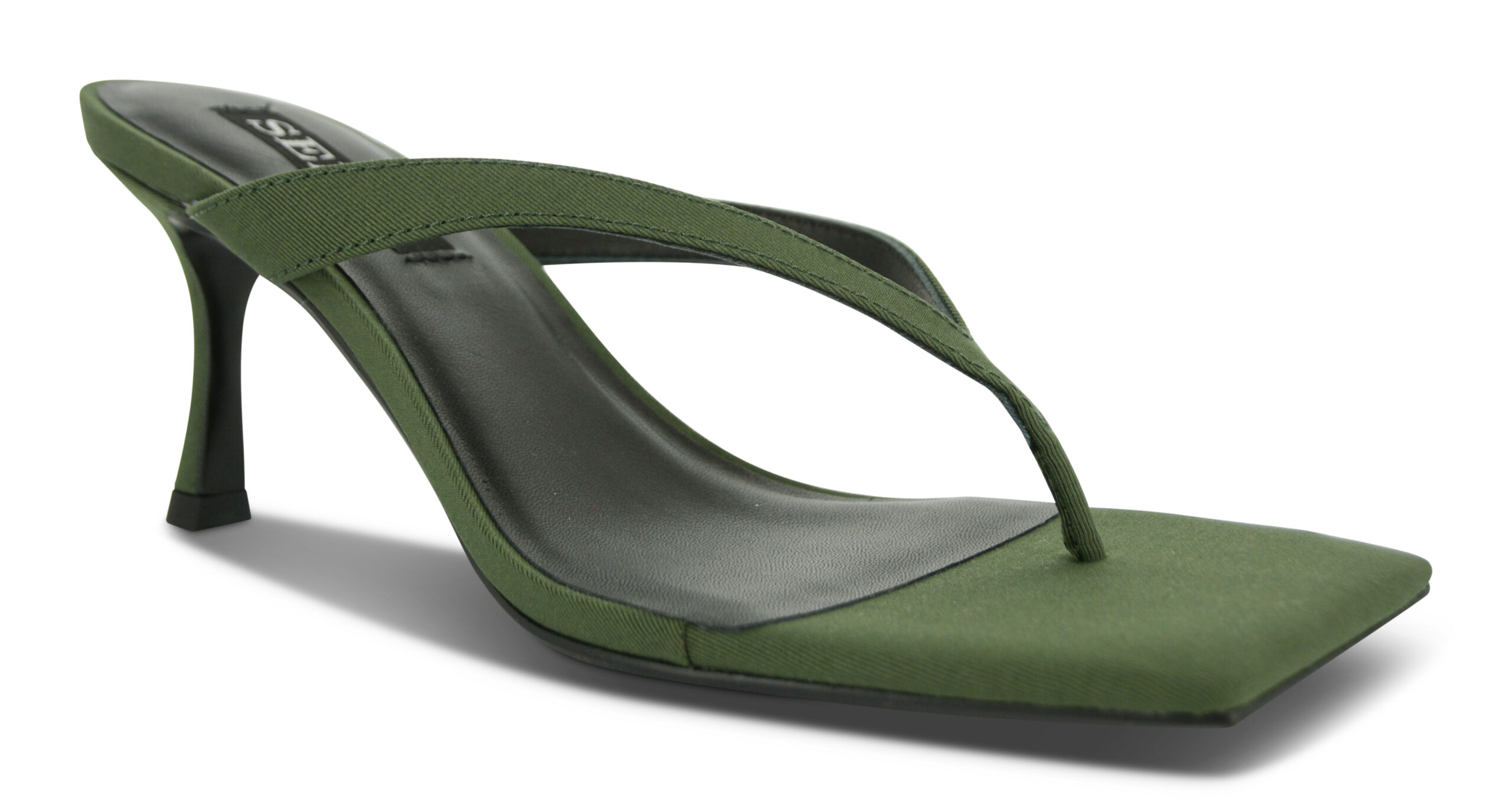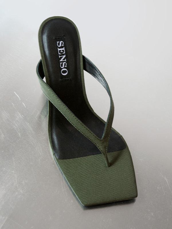 Khaki leather heels featuring a slip-on style, and square toe.