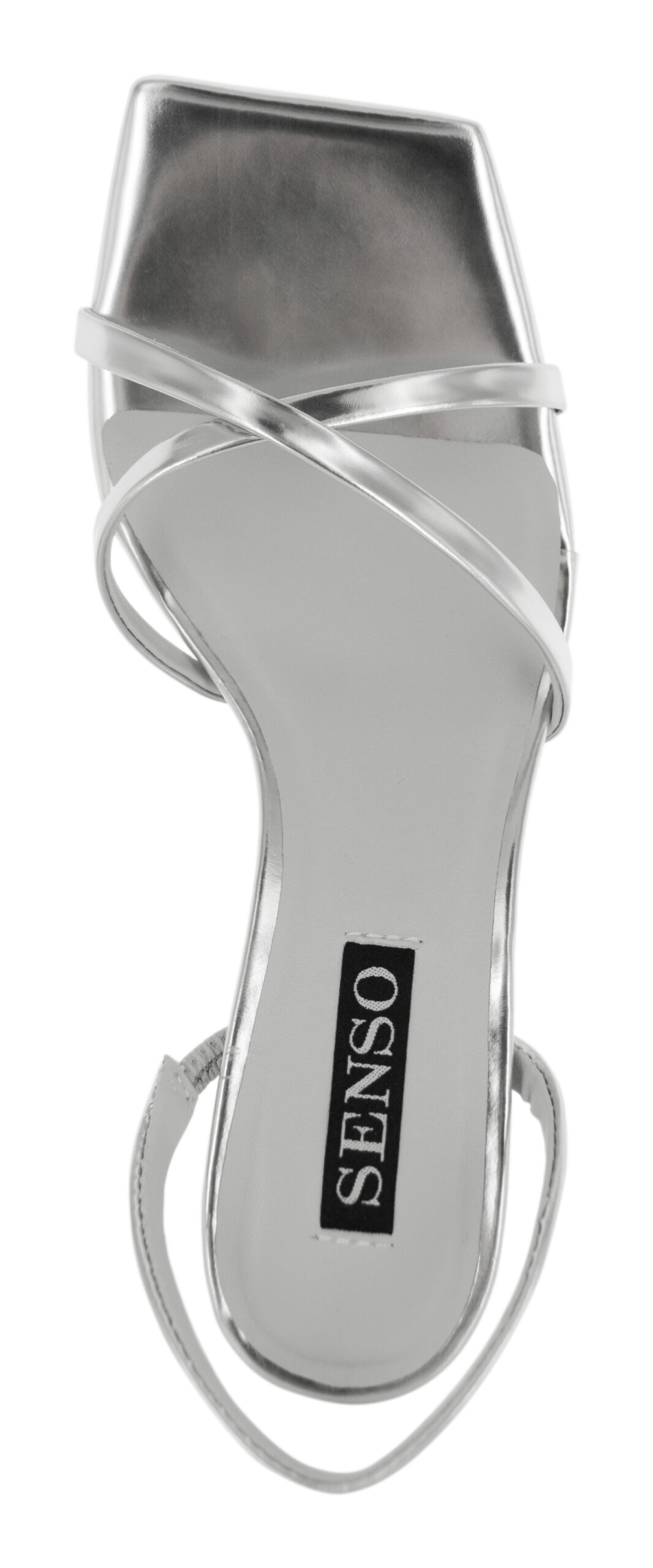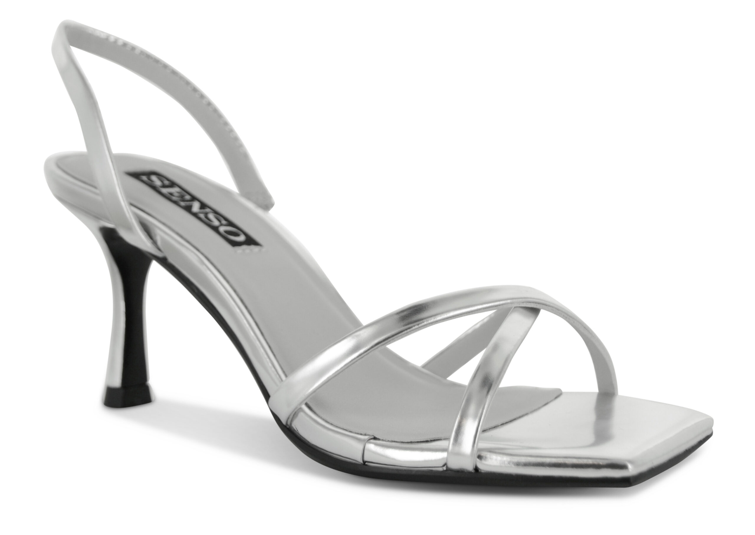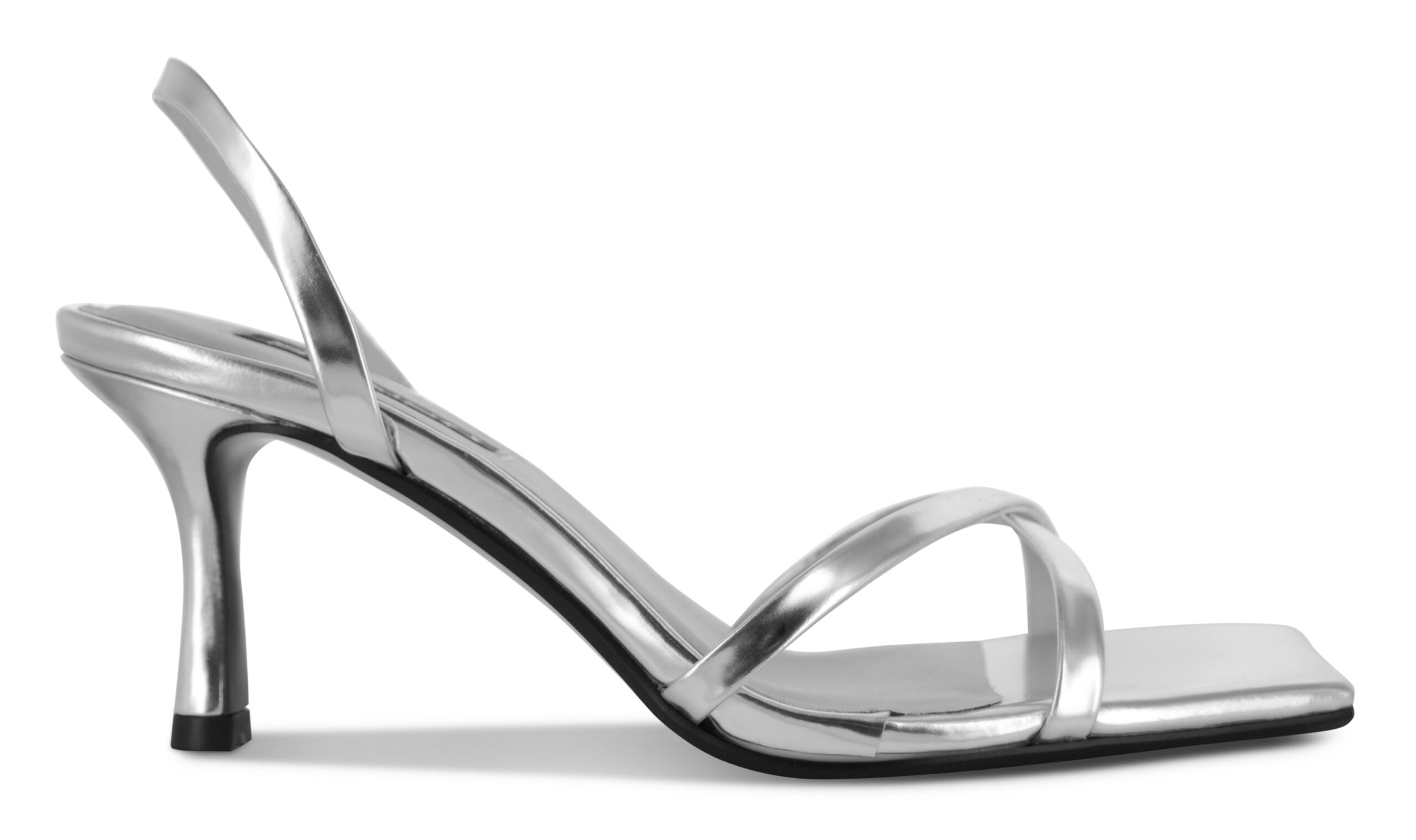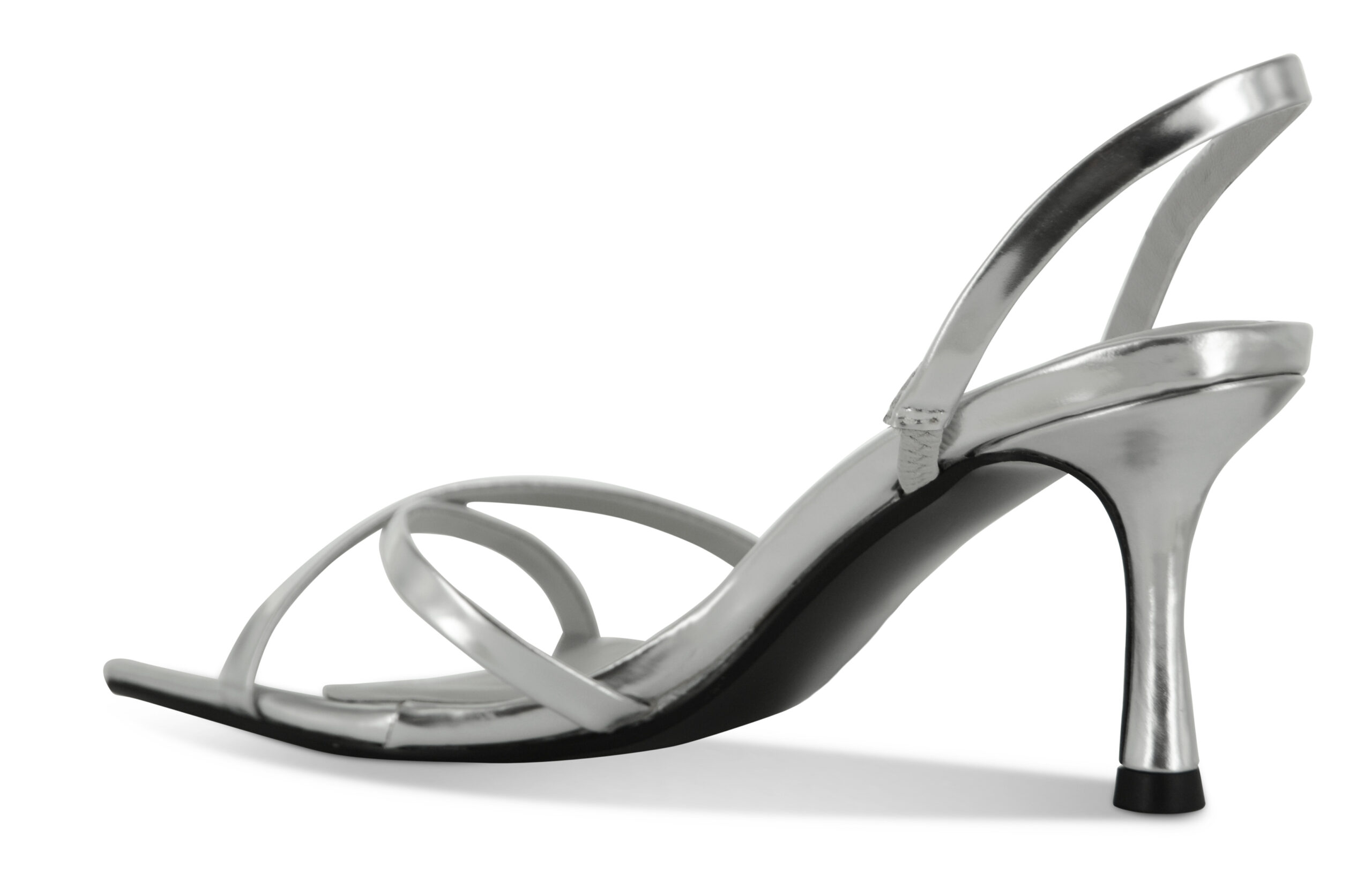 Silver chrome heeled sandals, featuring an angled square toe and crisscross strap detailing