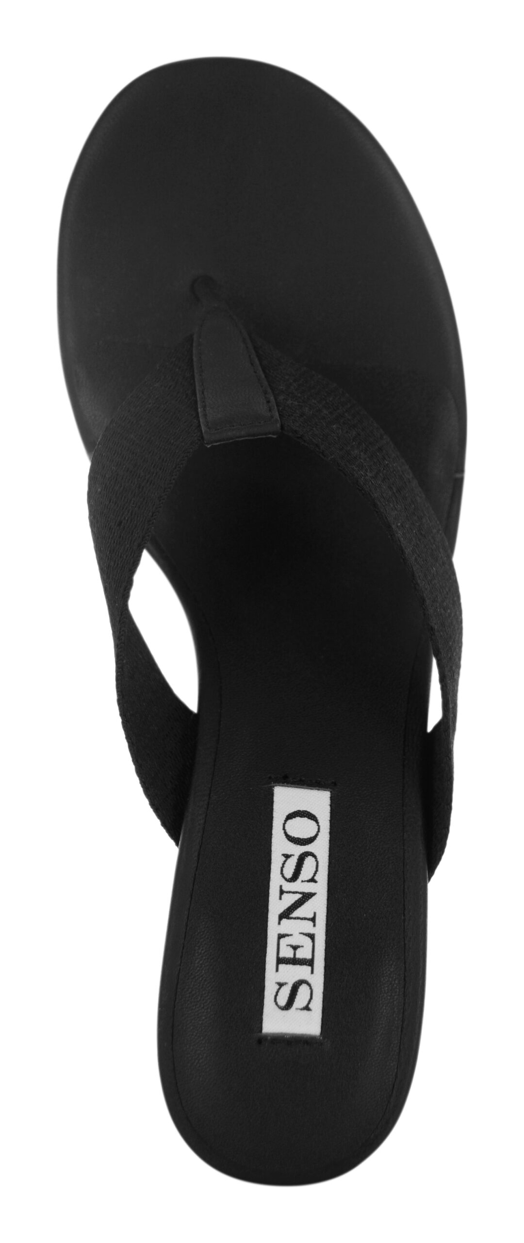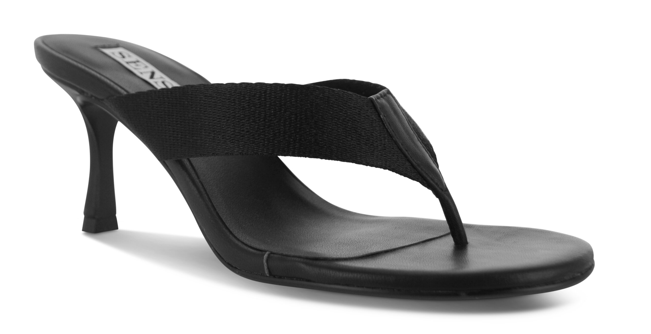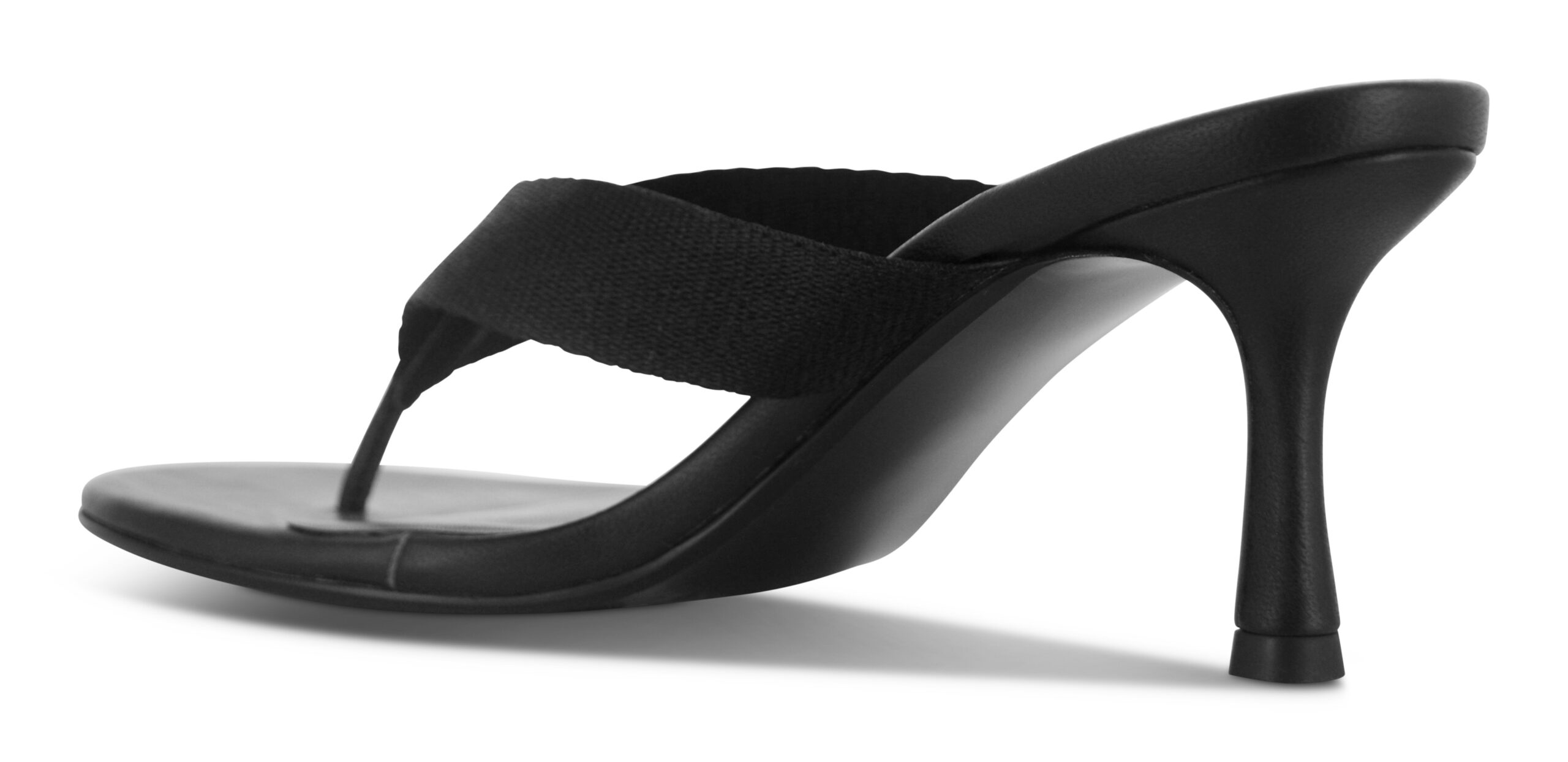 Ebony kid leather heeled sandals featuring a slip-on design, fabric thong strap, and rounded toe