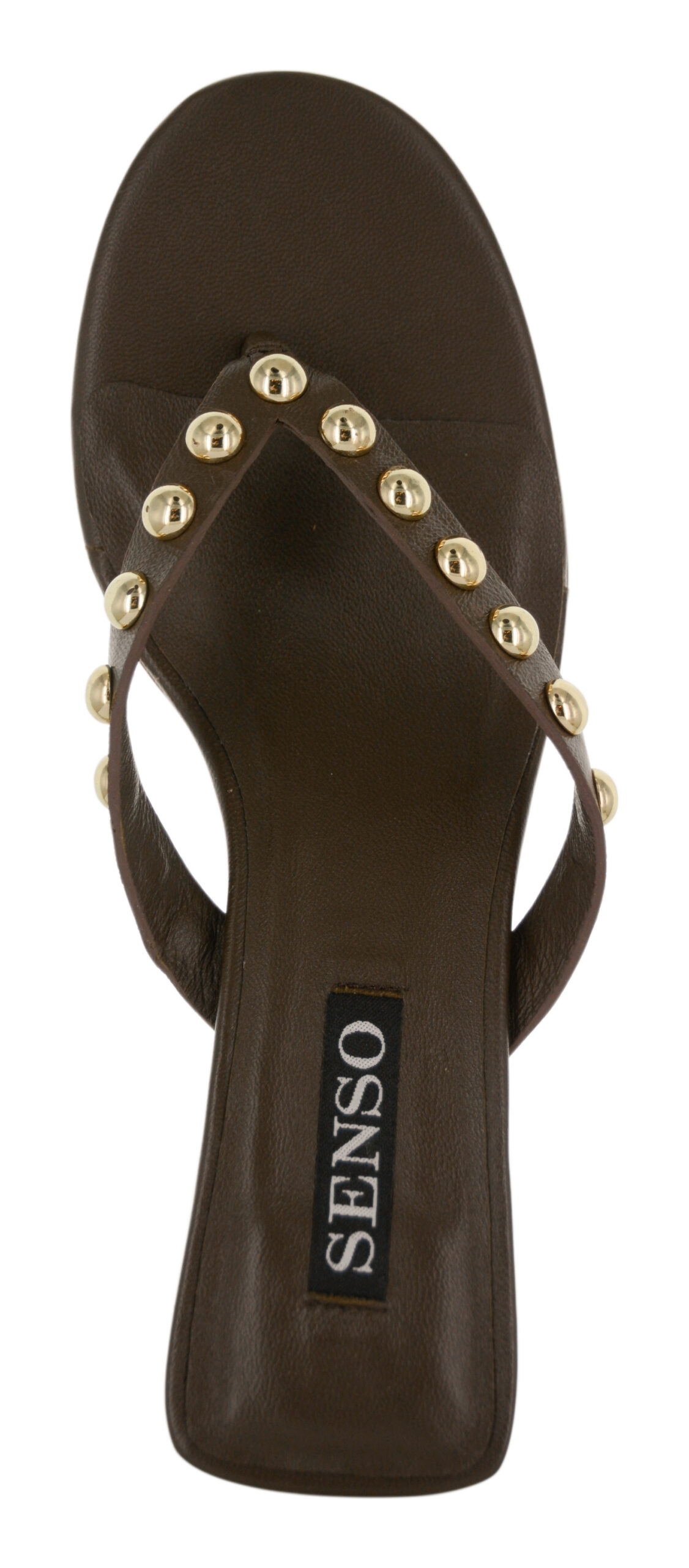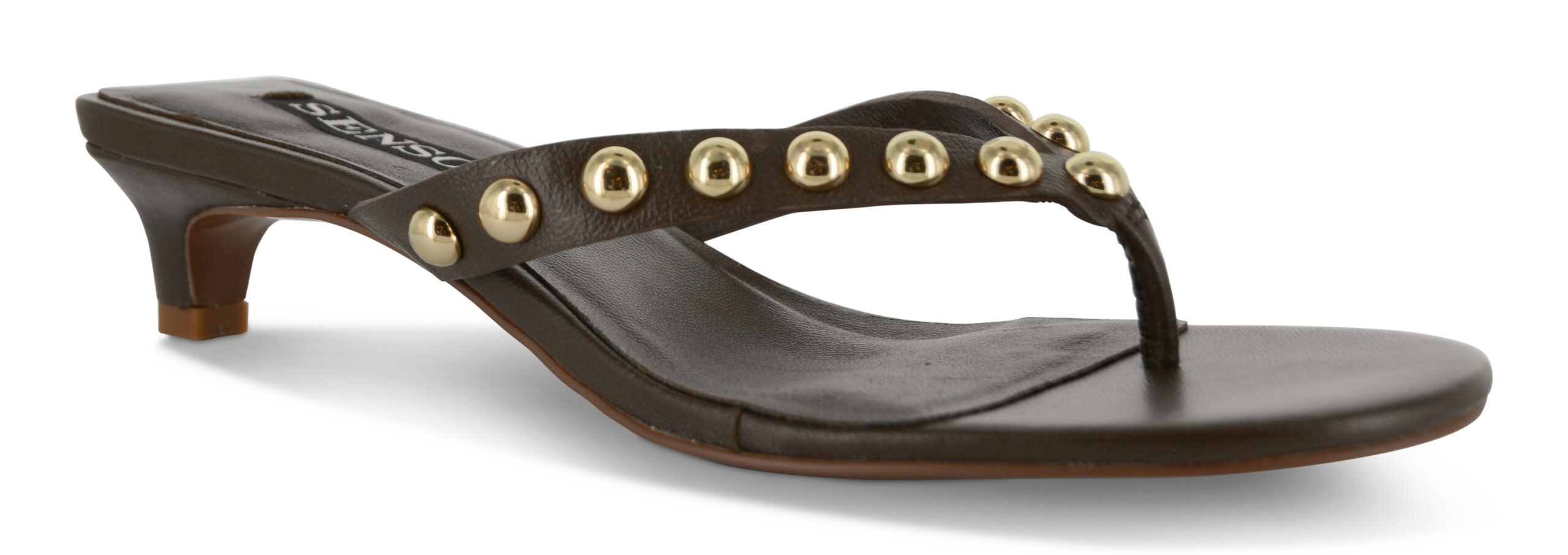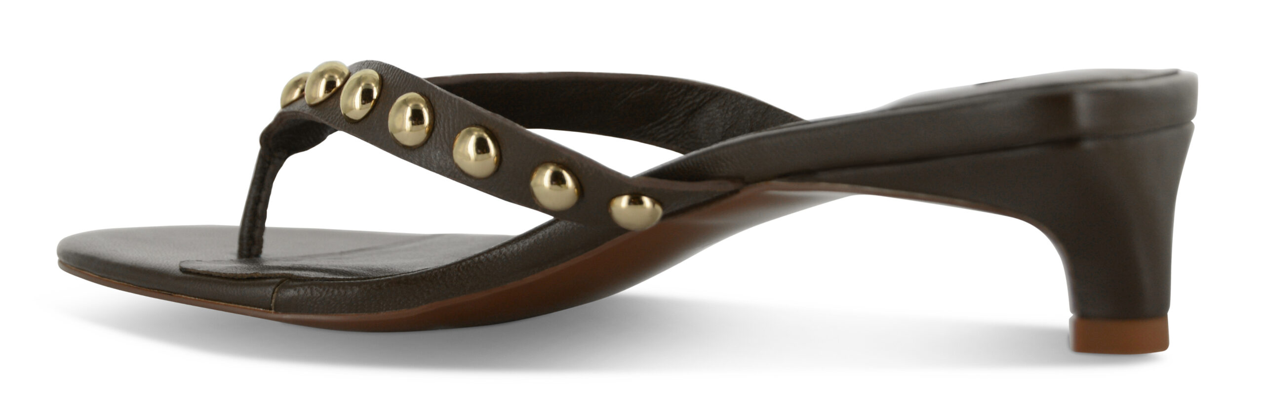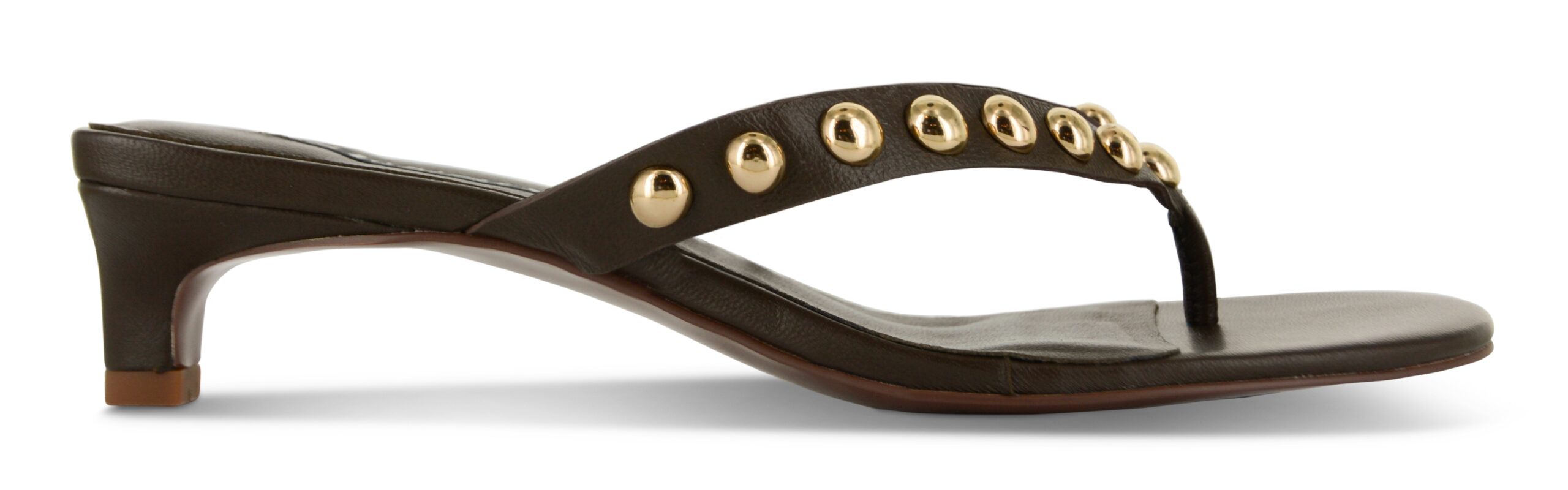 Espresso calf leather kitten heel sandals featuring a thong silhouette, silver-tone studded straps, and a rounded toe