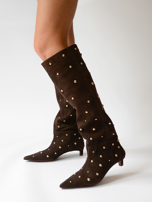 Dark brown calf suede tube boot, featuring a kitten heel, pointed toe and gold stud detail