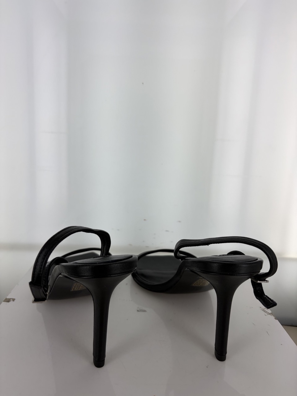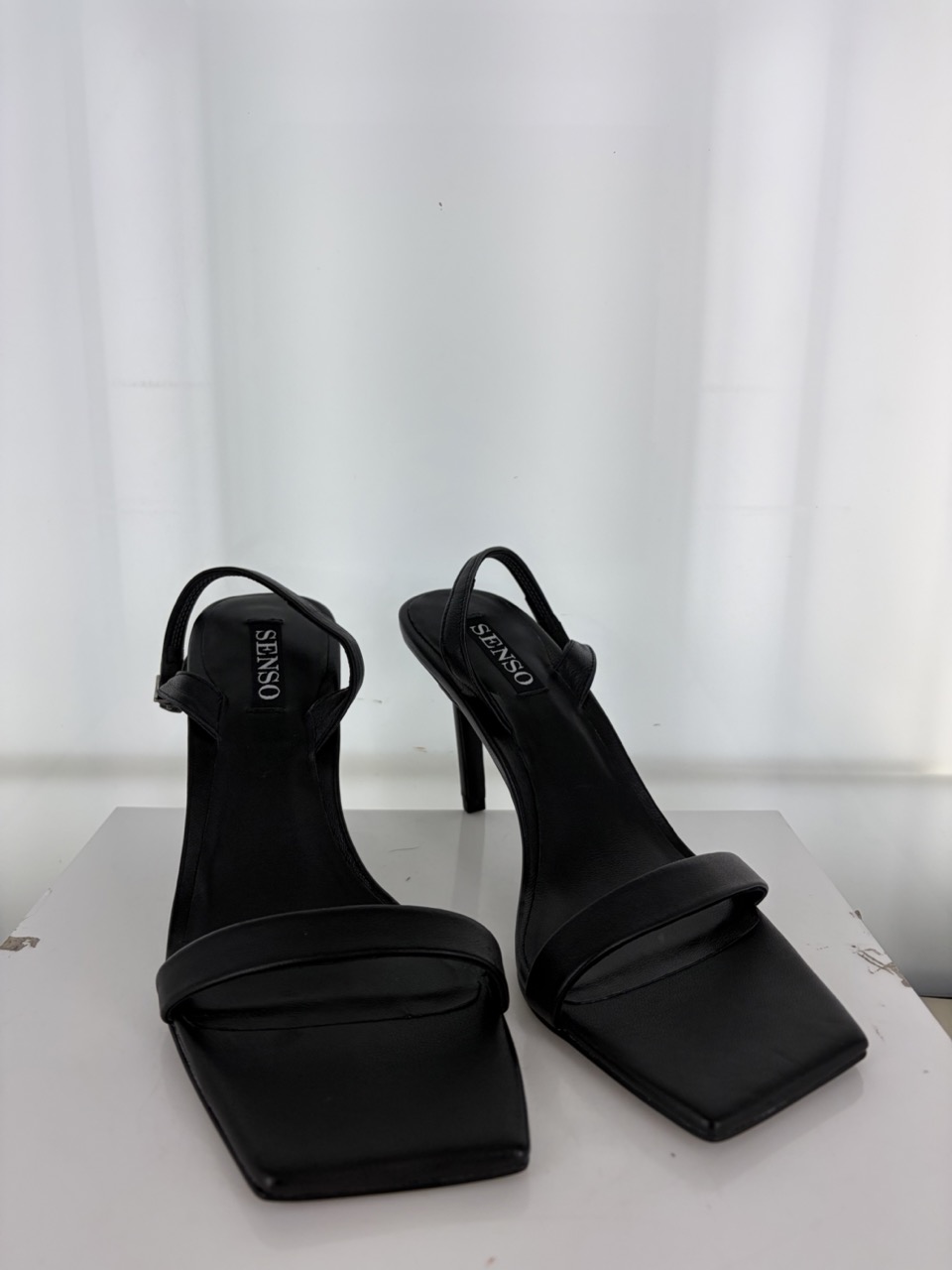 Ebony kid leather stiletto heels featuring a square open toe with ebony straps