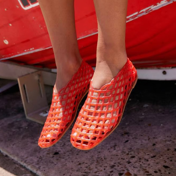 Strawberry rubber netting ballet flats featuring a branded insole, round toe, slip-on style, and flat rubber sole.