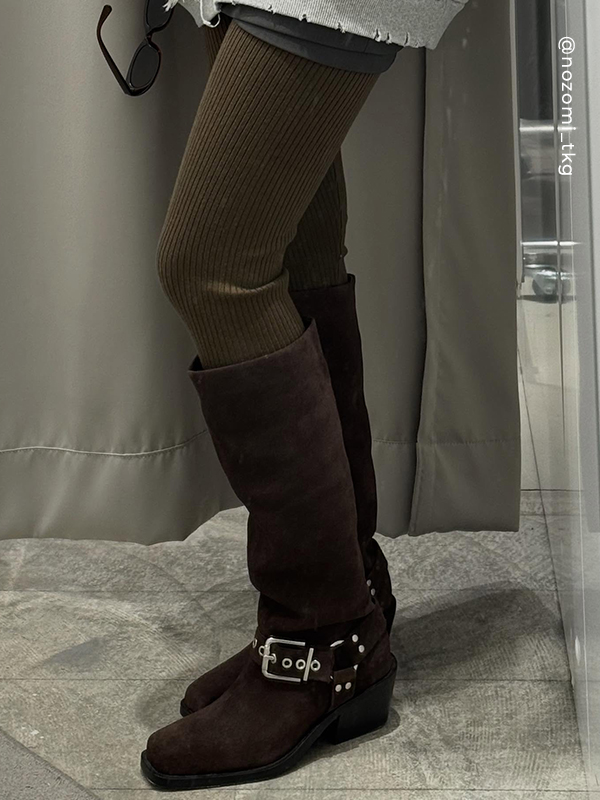 Dark brown suede leather knee-high tube boot, featuring a block heel, square toe and silver stirrup detail