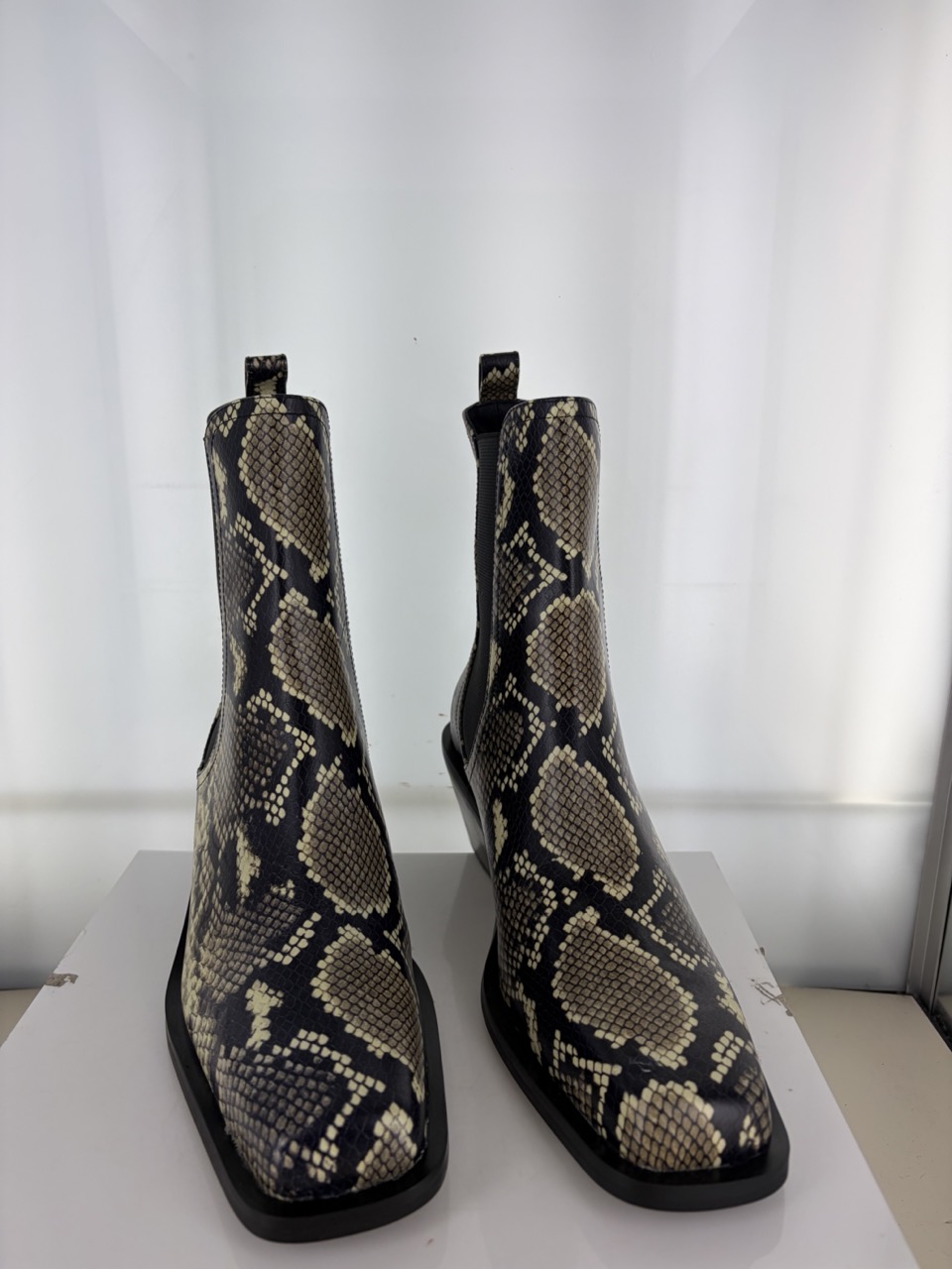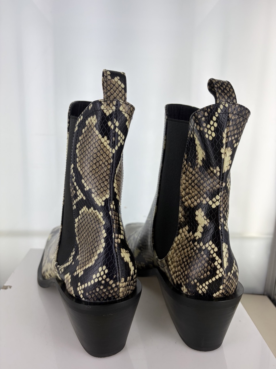 Snake print leather ankle boot, featuring a block heel, elasticated gussets and square toe