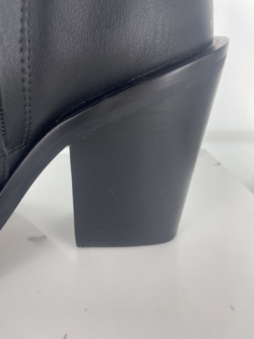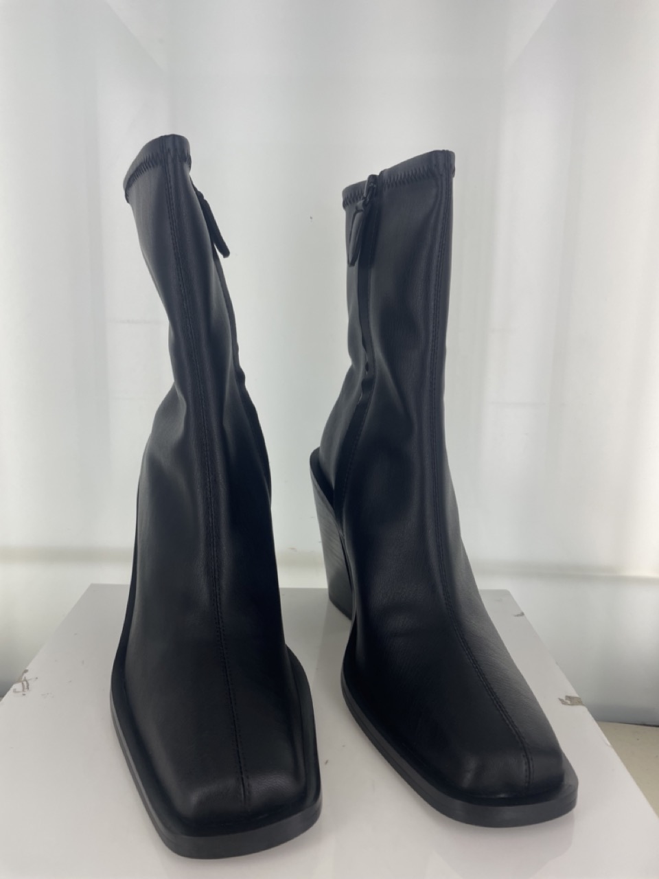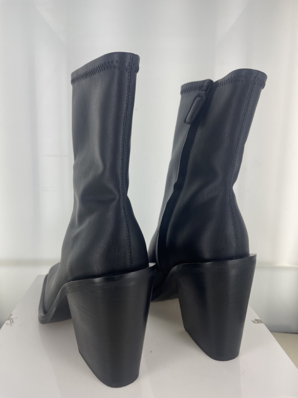 Black vegan leather ankle boot, featuring a square toe, block heel and a concealed zip