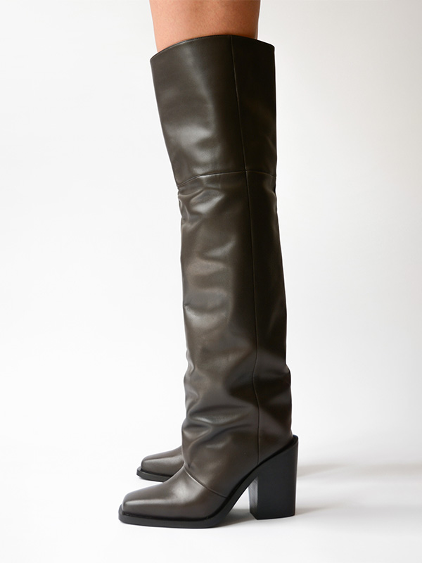 Chocolate calf leather thigh-high boots, featuring a square toe and block heel.