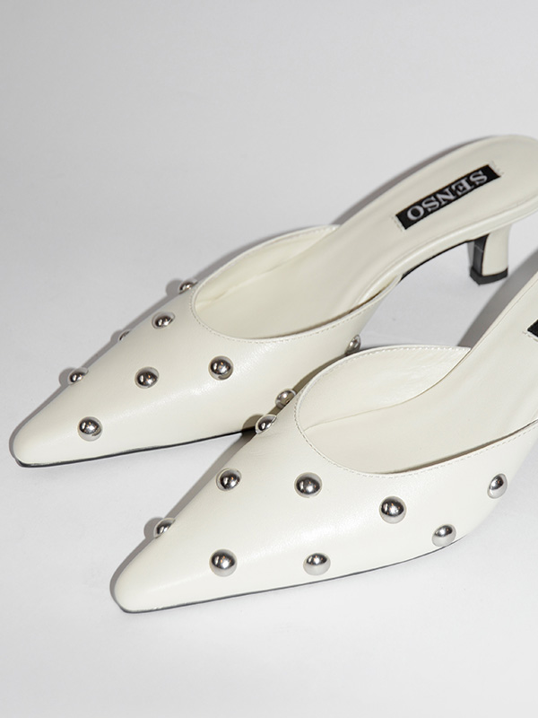 White leather kitten heel mule, featuring a pointed toe and silver stud detailing