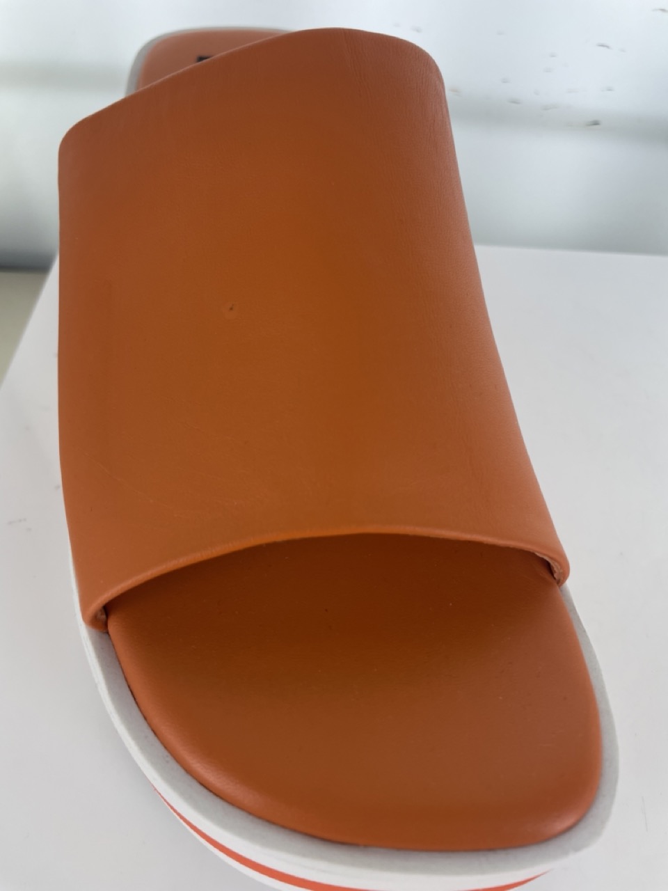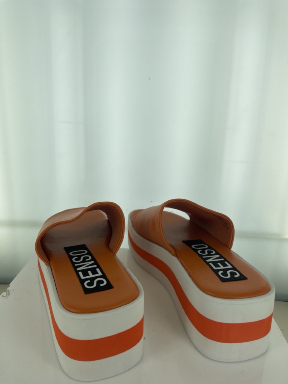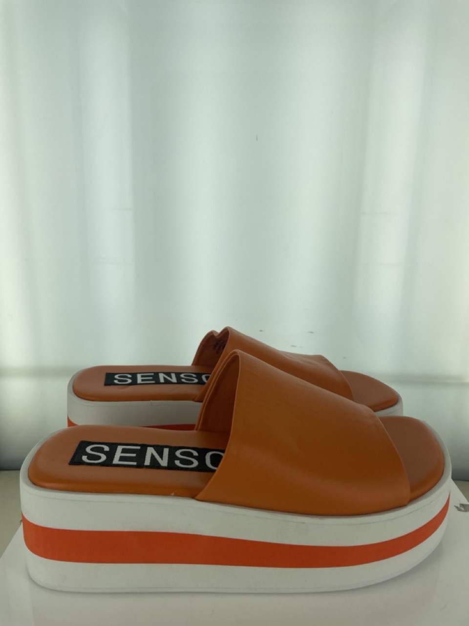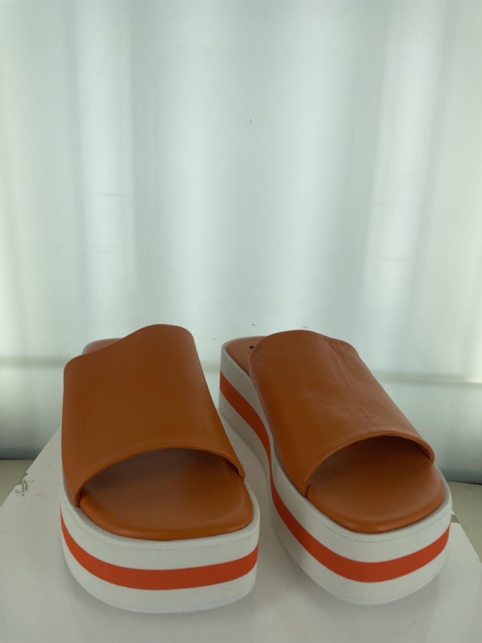 Tangerine matte kid material featuring an elevated platform, light rubber sole thick front strap with a slip- on design.