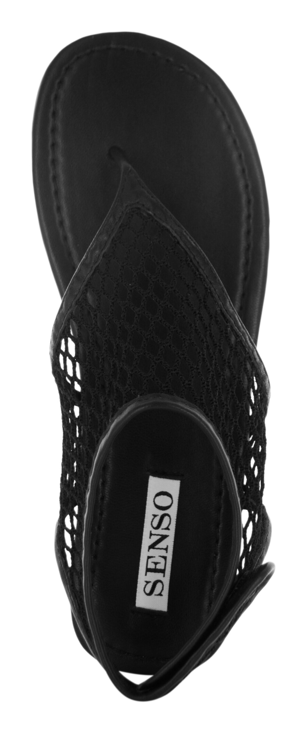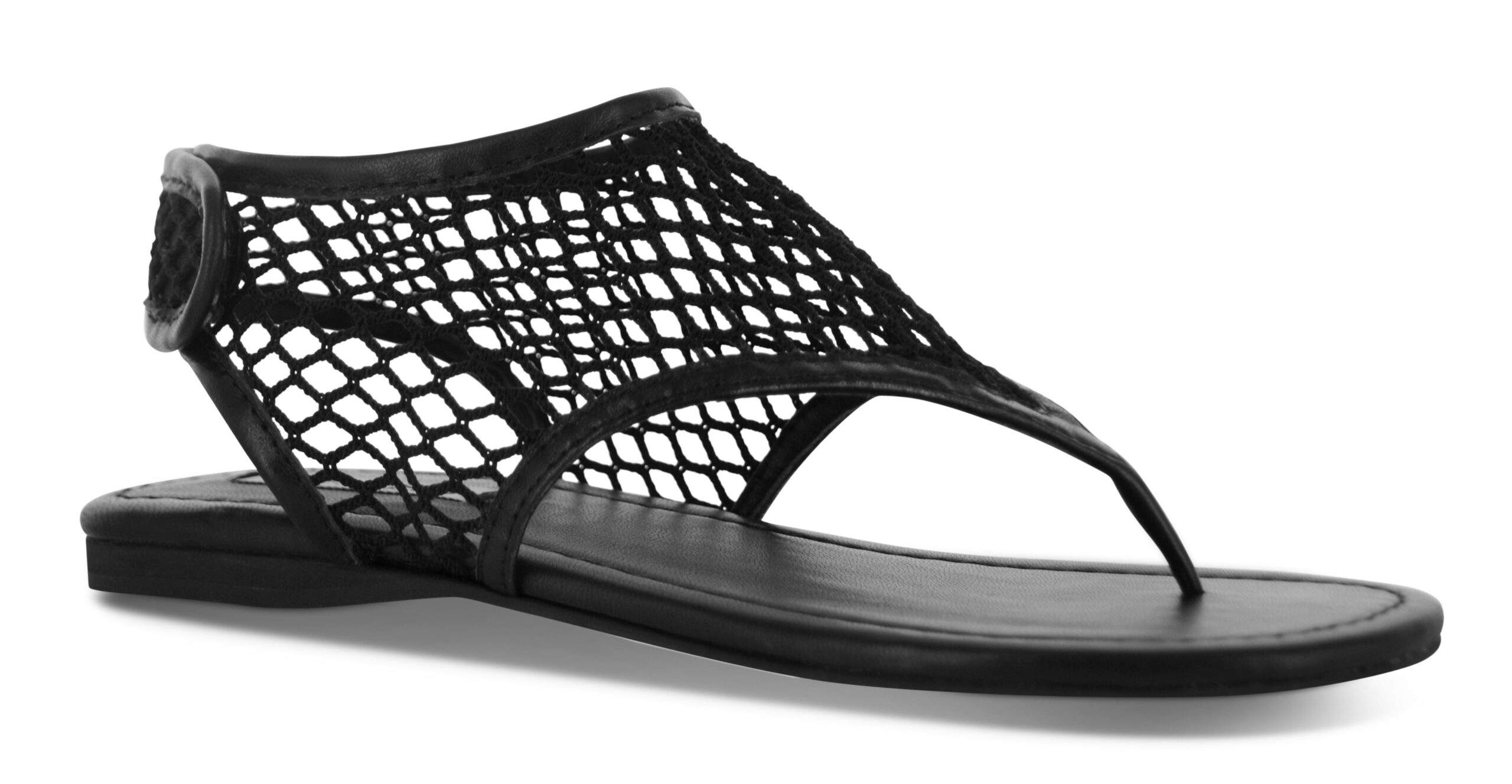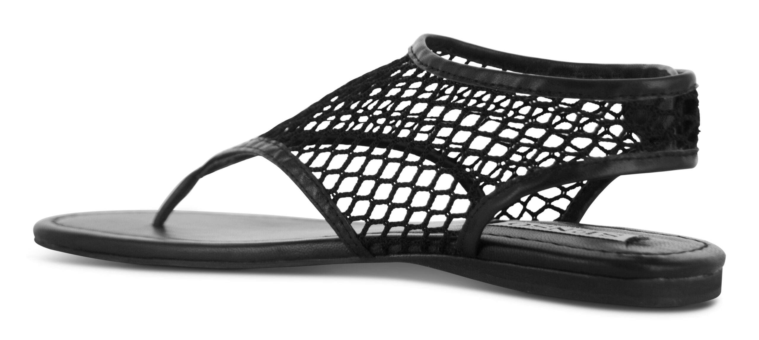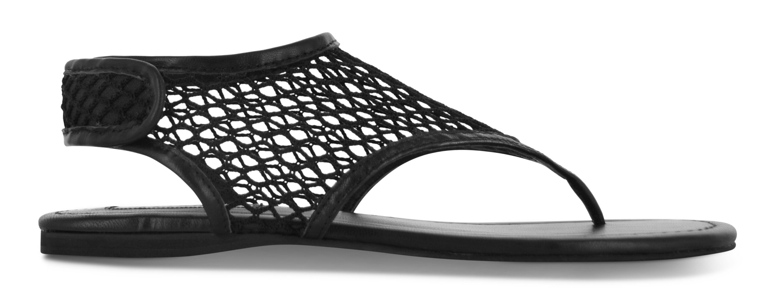 Ebony kid leather netted sandals featuring a net mesh upper, a thong silhouette, and an adjustable ankle velcro strap