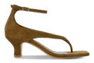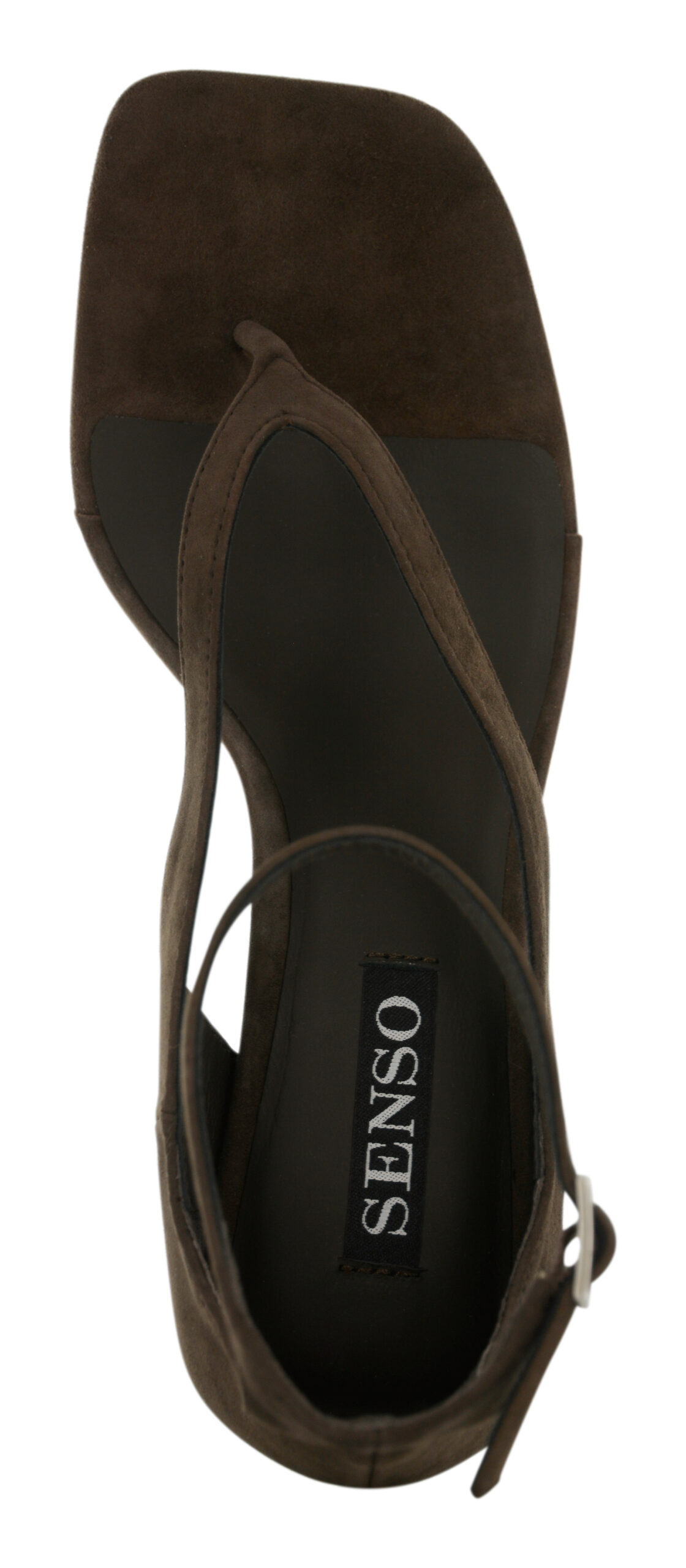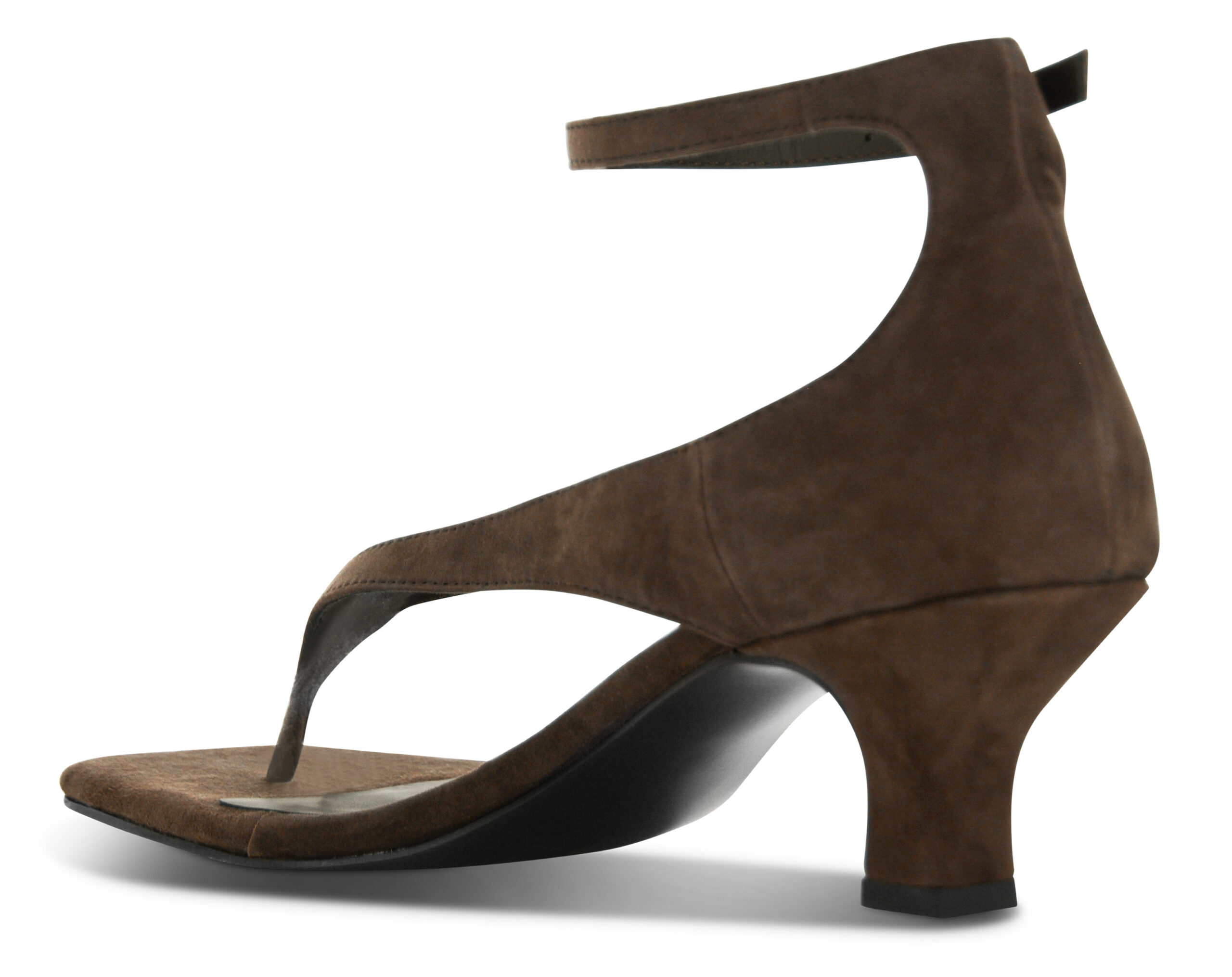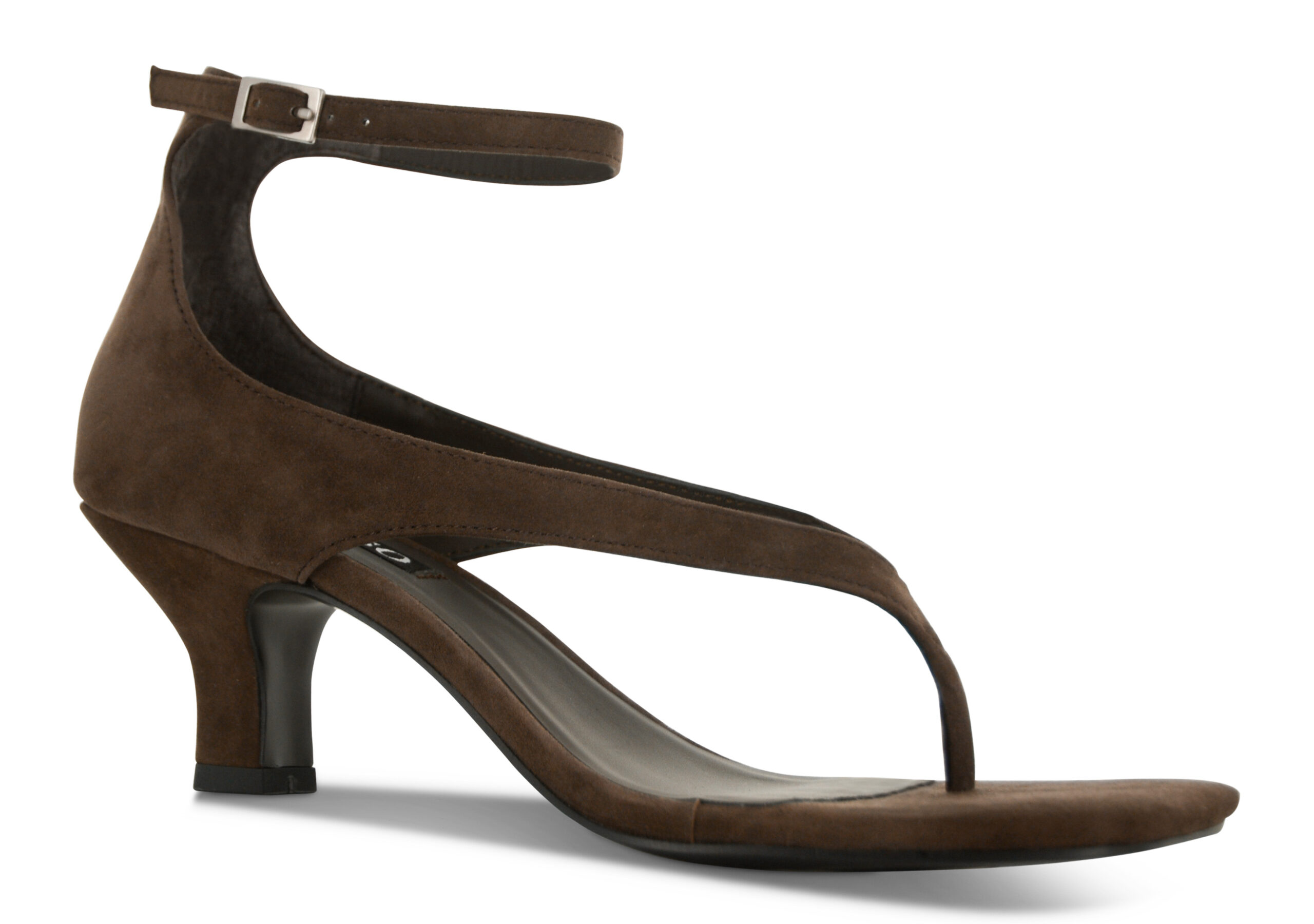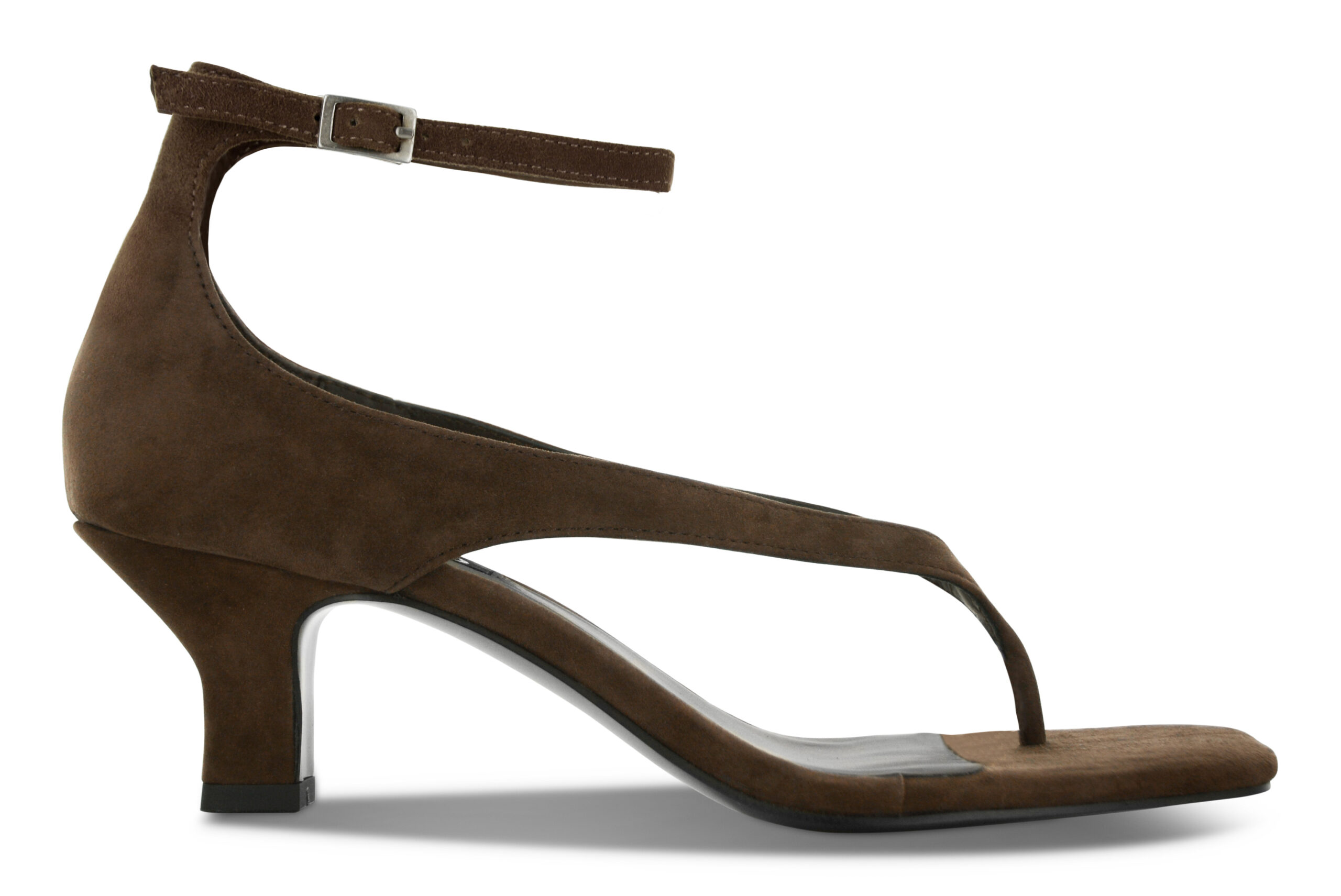 Chocolate suede heels, featuring a thong-style strap and a square, round toe.