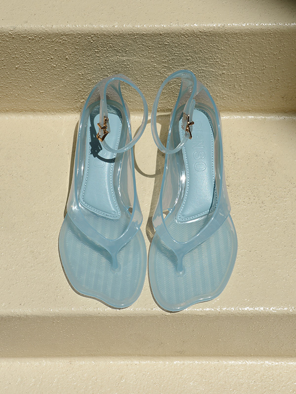 Sky rubber heeled sandals featuring a sculpted asymmetrical toe, thong silhouette, and an adjustable buckle strap