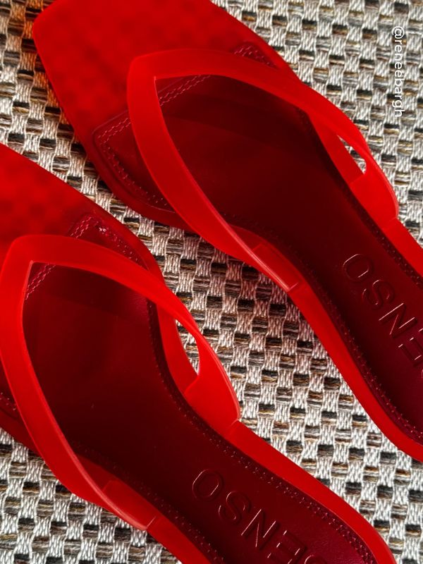 Cherry frosted rubber heels featuring a slip-on thong silhouette with a square toe