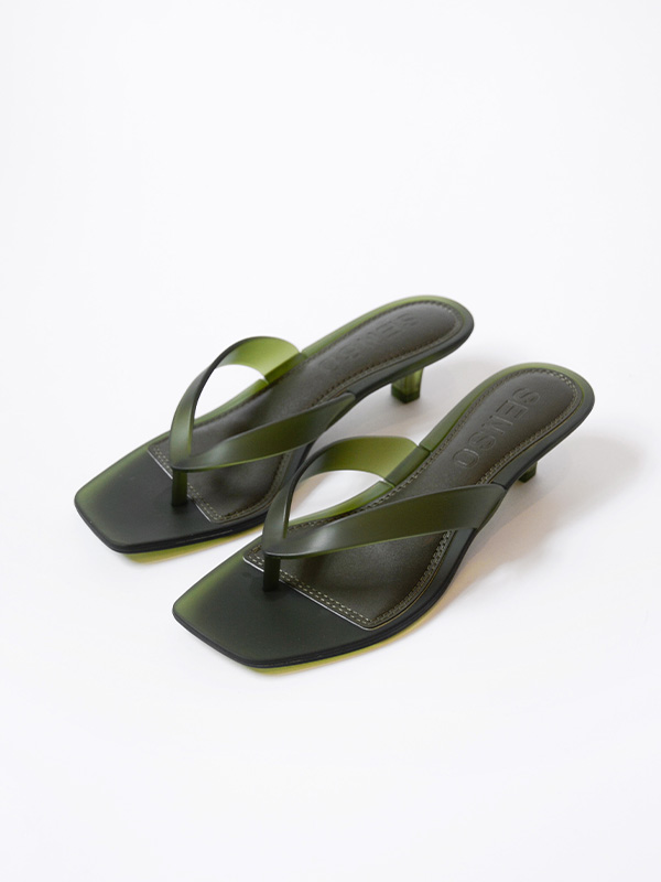 Olive frosted rubber heels featuring a slip-on thong silhouette with a square toe