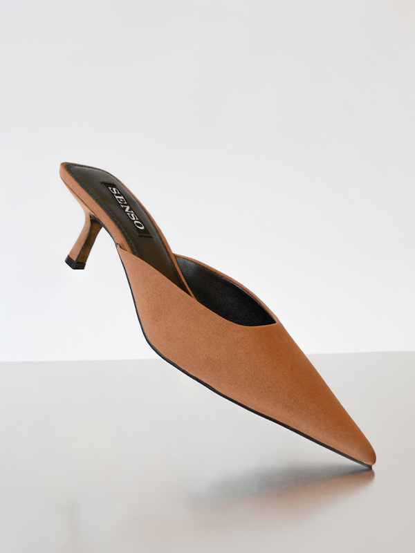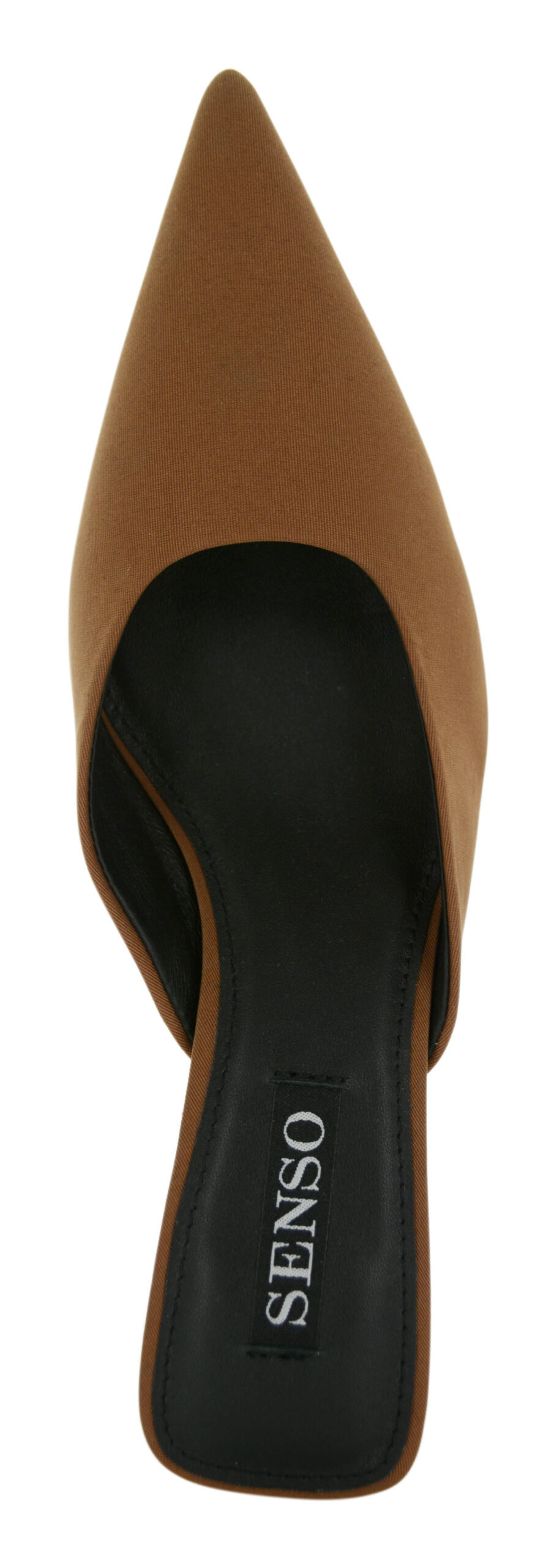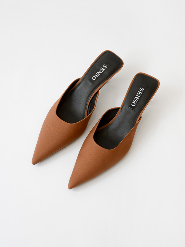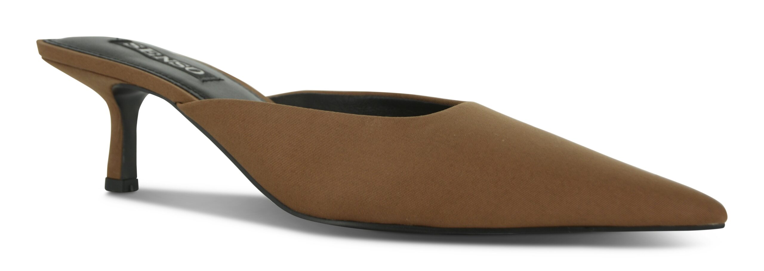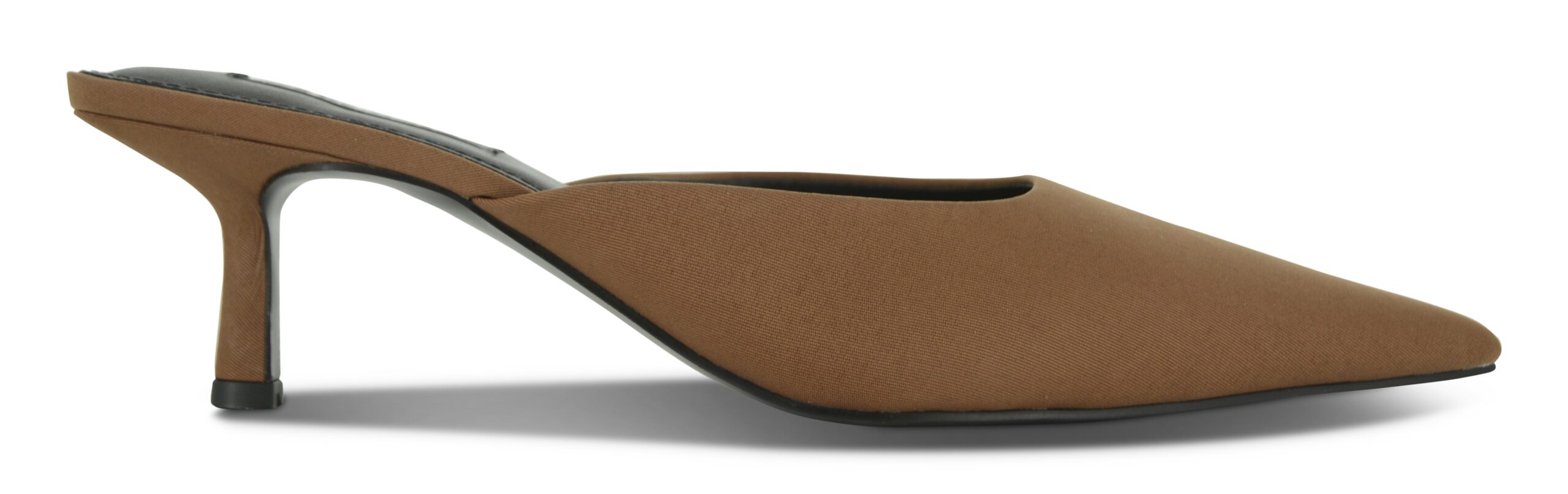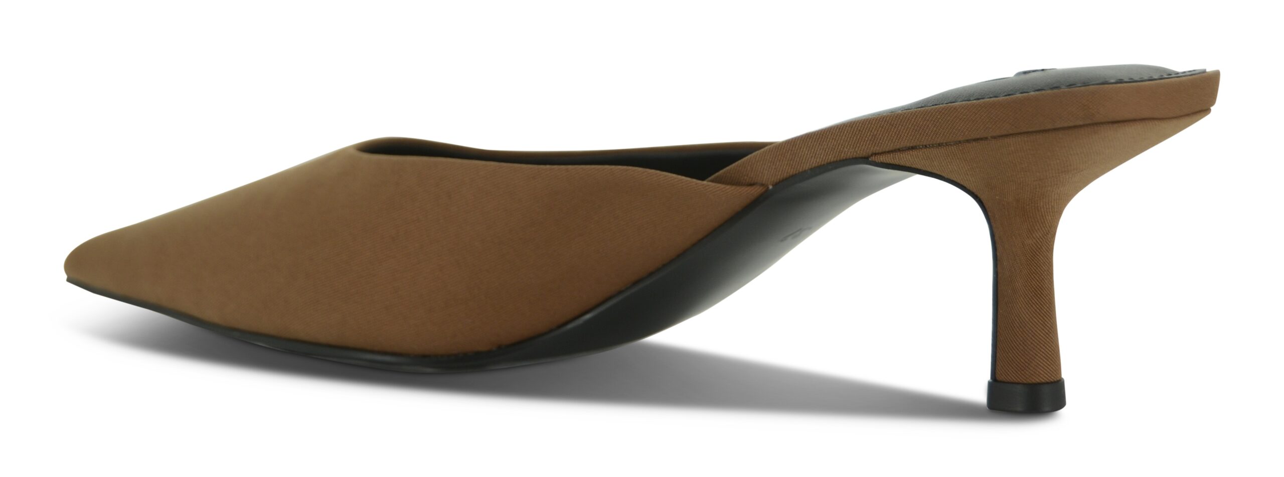 Chestnut grosgrain fabric slip-on mules featuring a pointed toe and a kitten heel.
