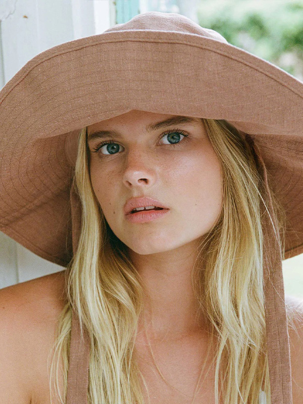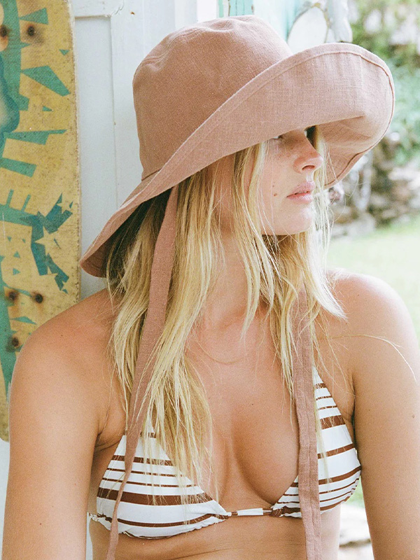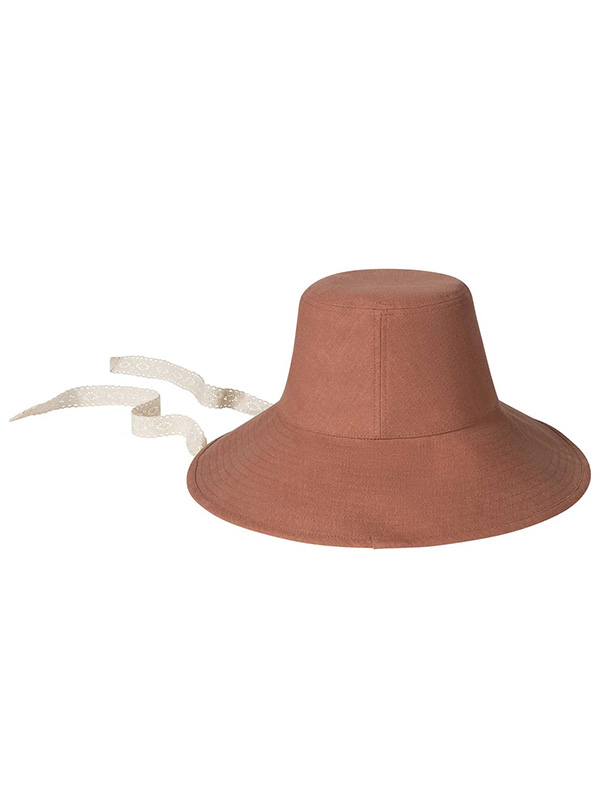 Clay cotton canvas wide-brim bucket hat featuring a simple, secure neck tie for all-day wear.