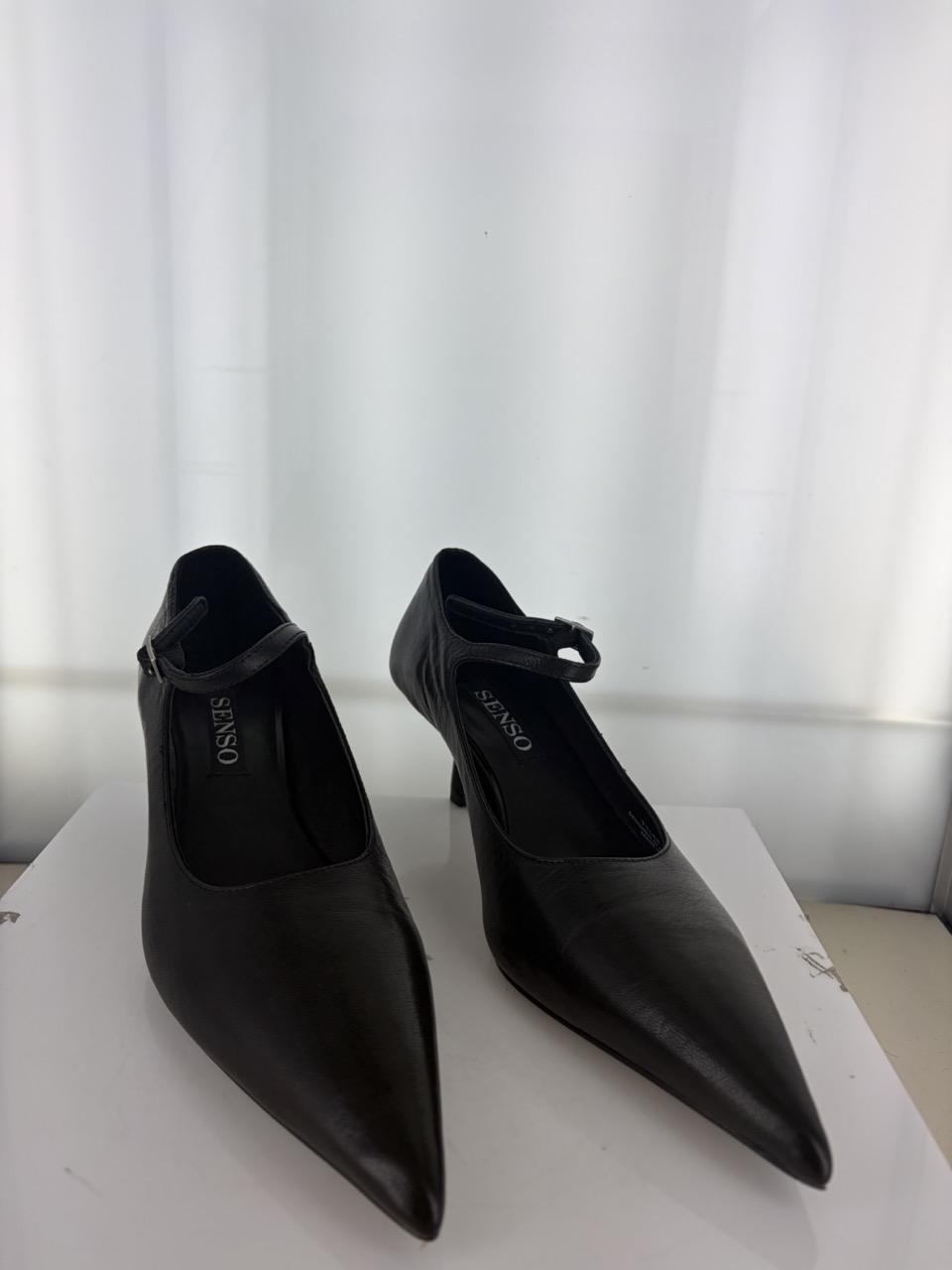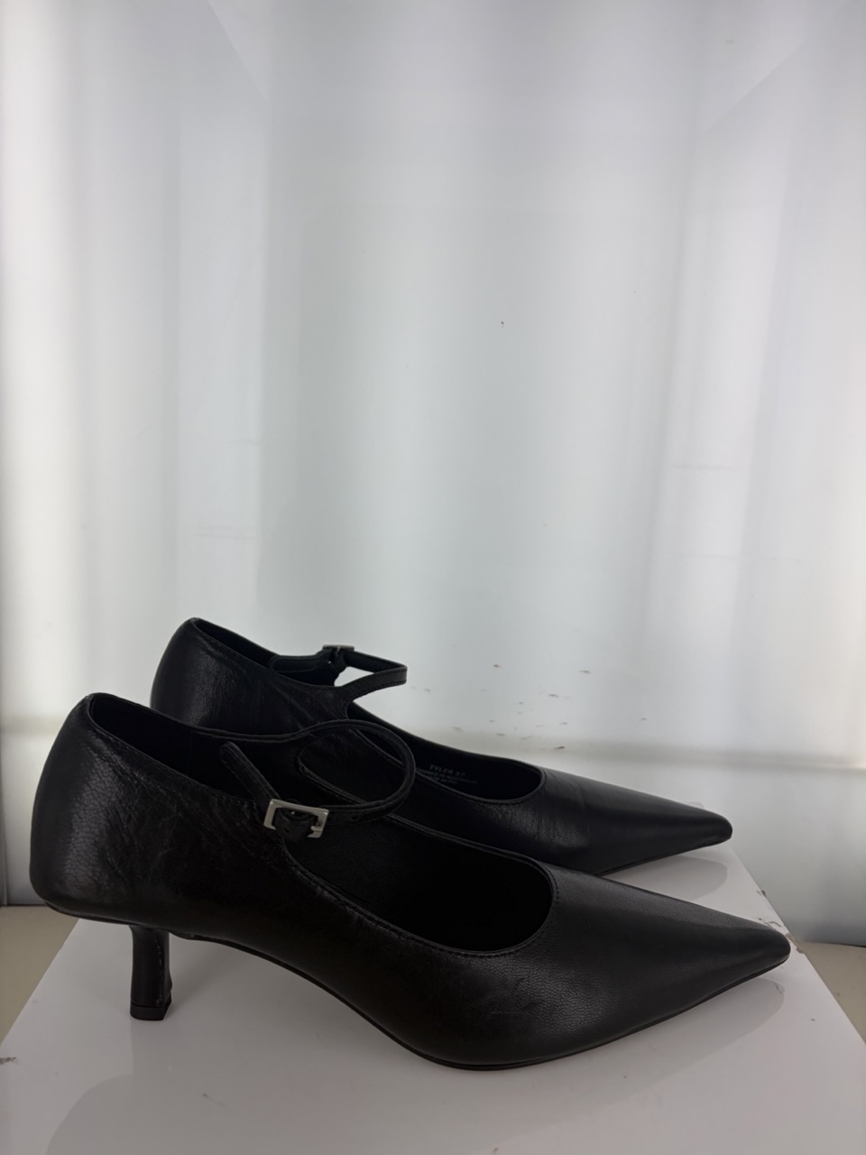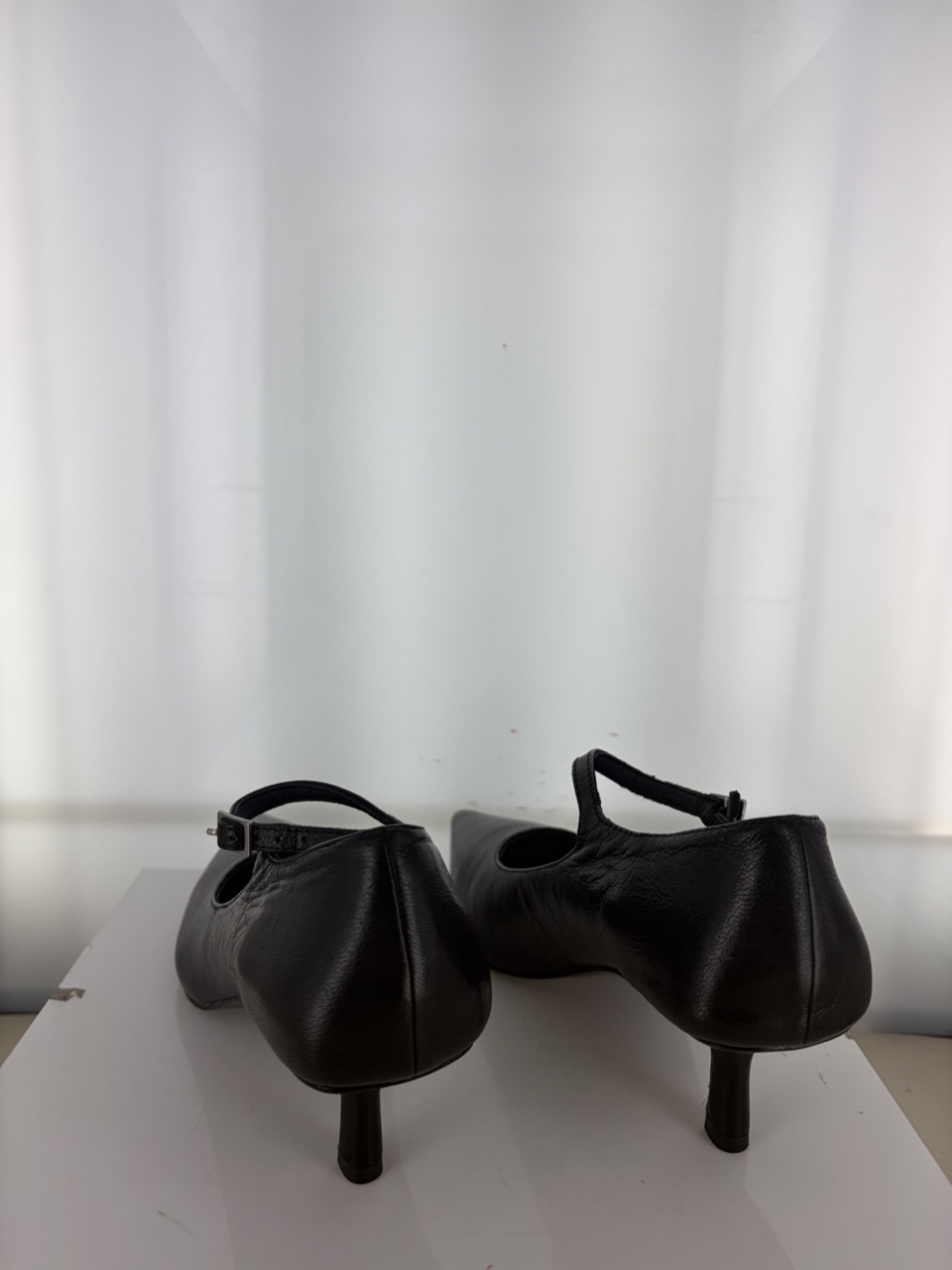 Ebony distressed leather court heels featuring a thin ankle strap, pointed toe and a stiletto heel