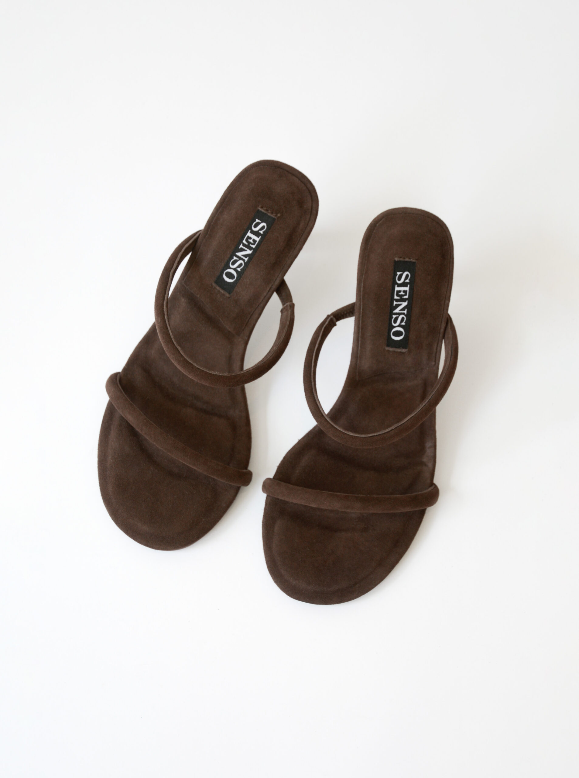 Cocoa suede high heeled sandals featuring padded straps with a sculpted round toe
