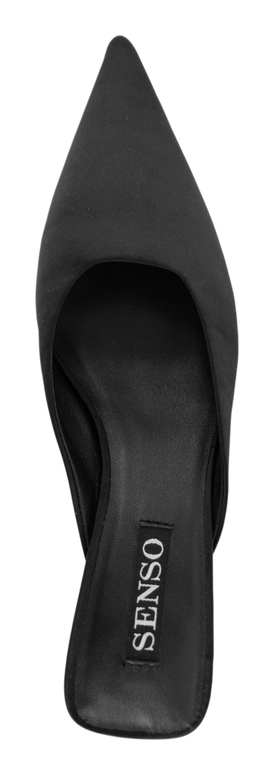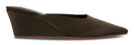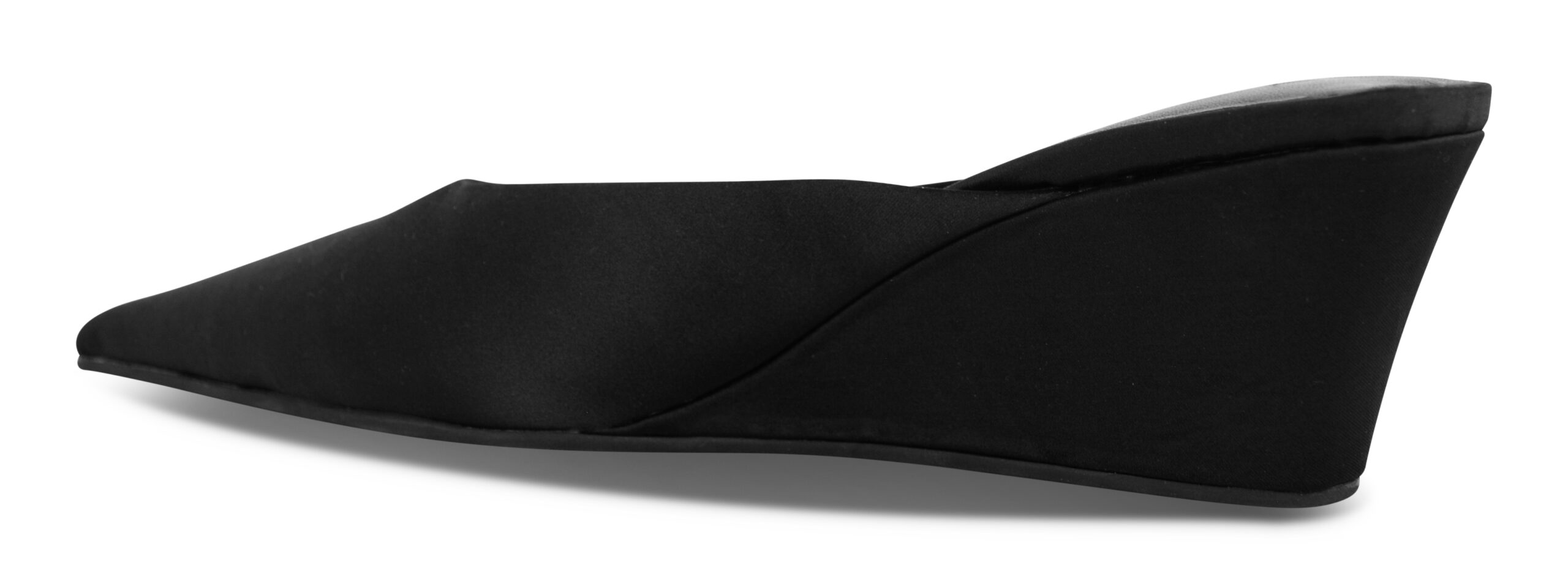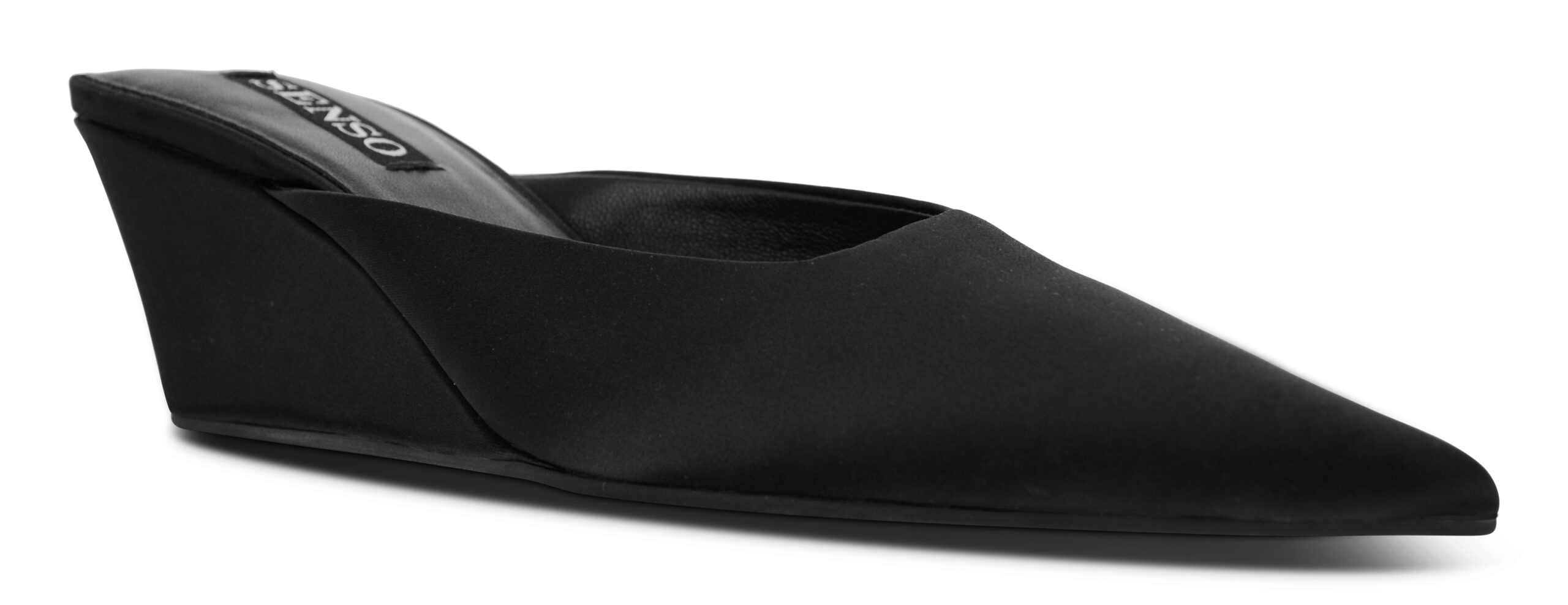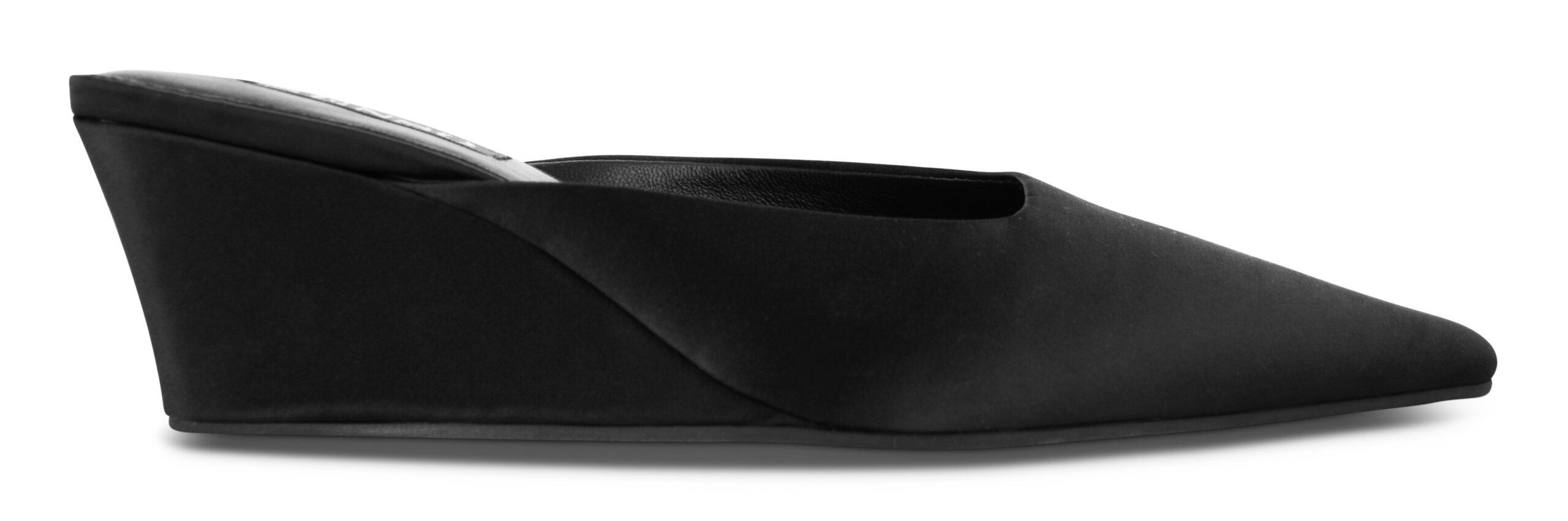 Ebony satin wedge heel featuring a pointed toe and slip on design