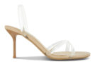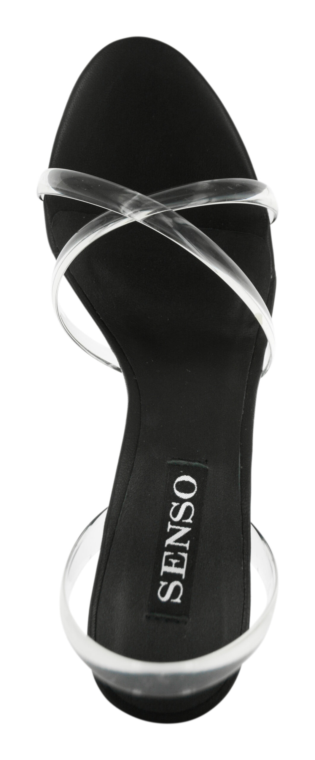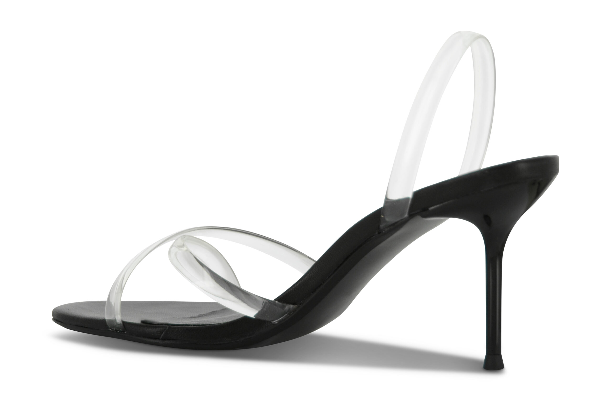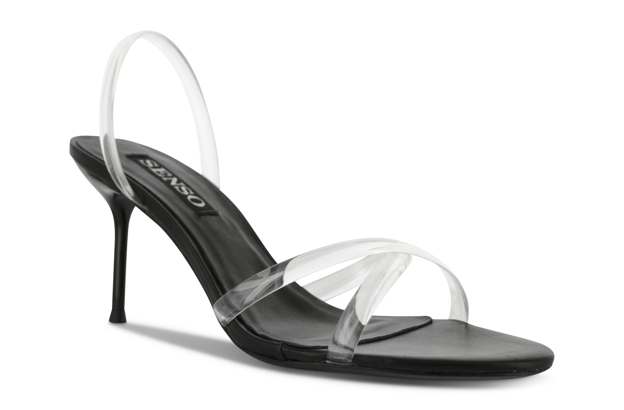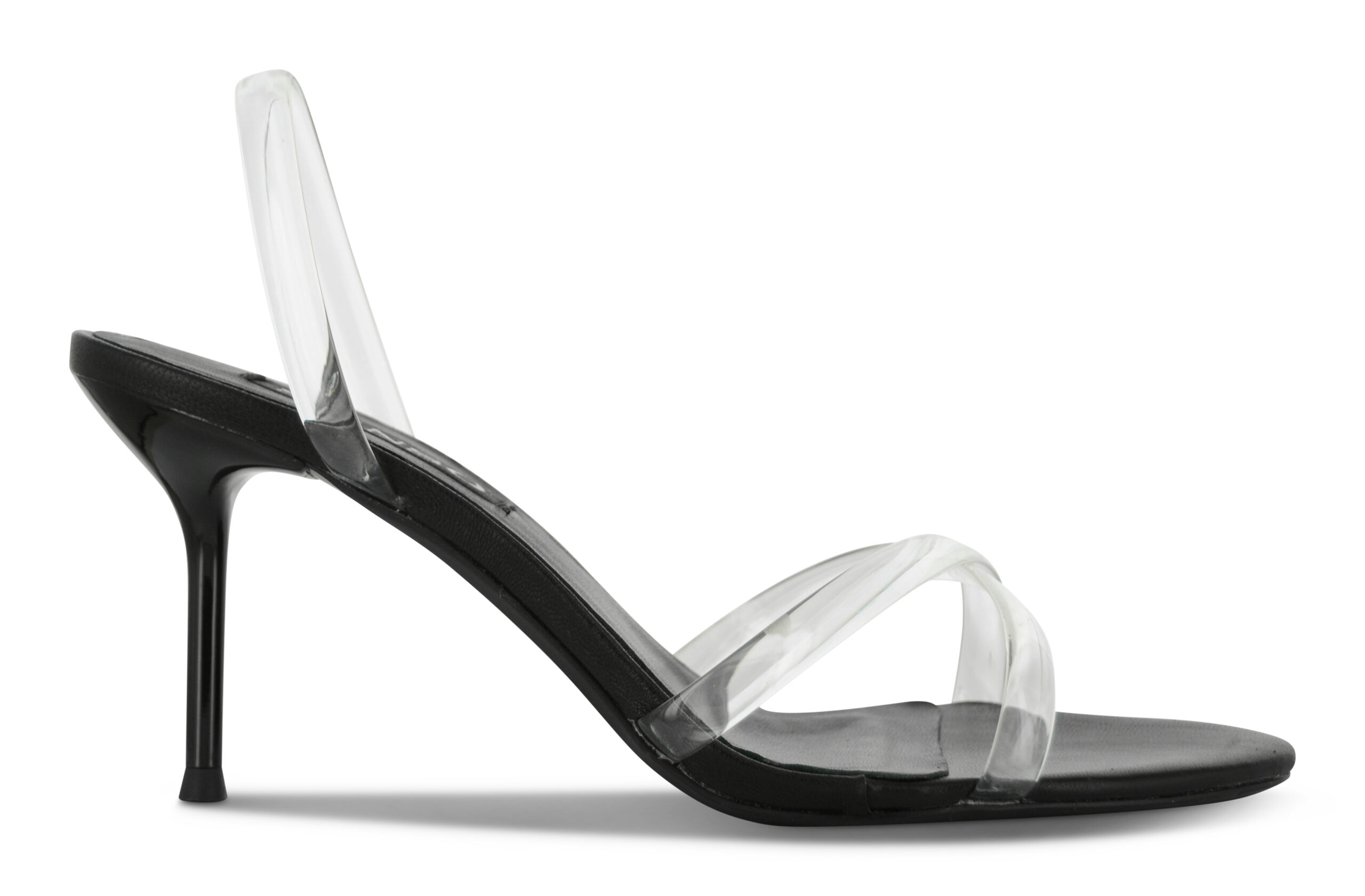 Ebony kid leather heels featuring clear criss-cross straps with a slingback design and rounded toe