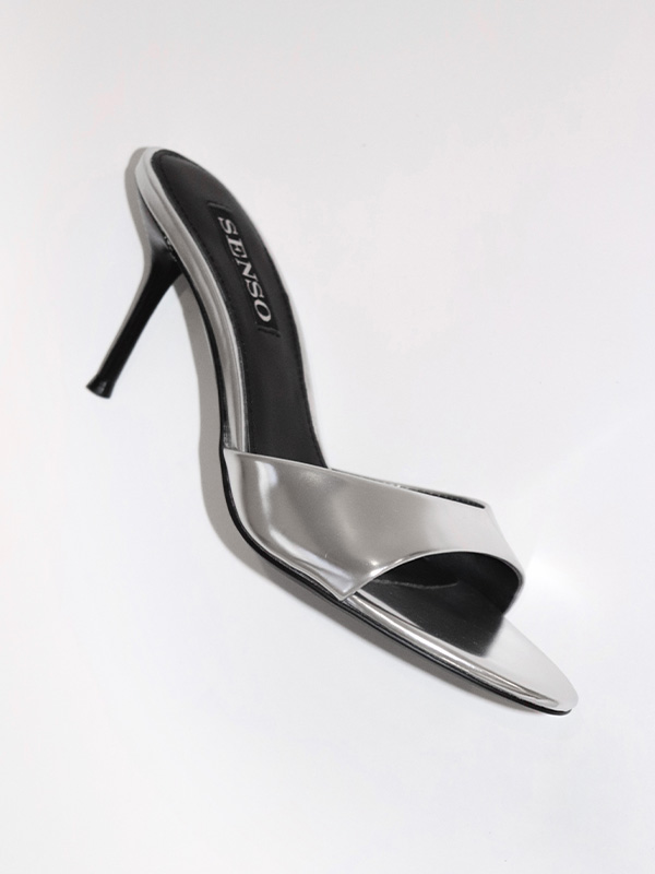 Silver kid leather heels featuring a slip-on design and a rounded toe