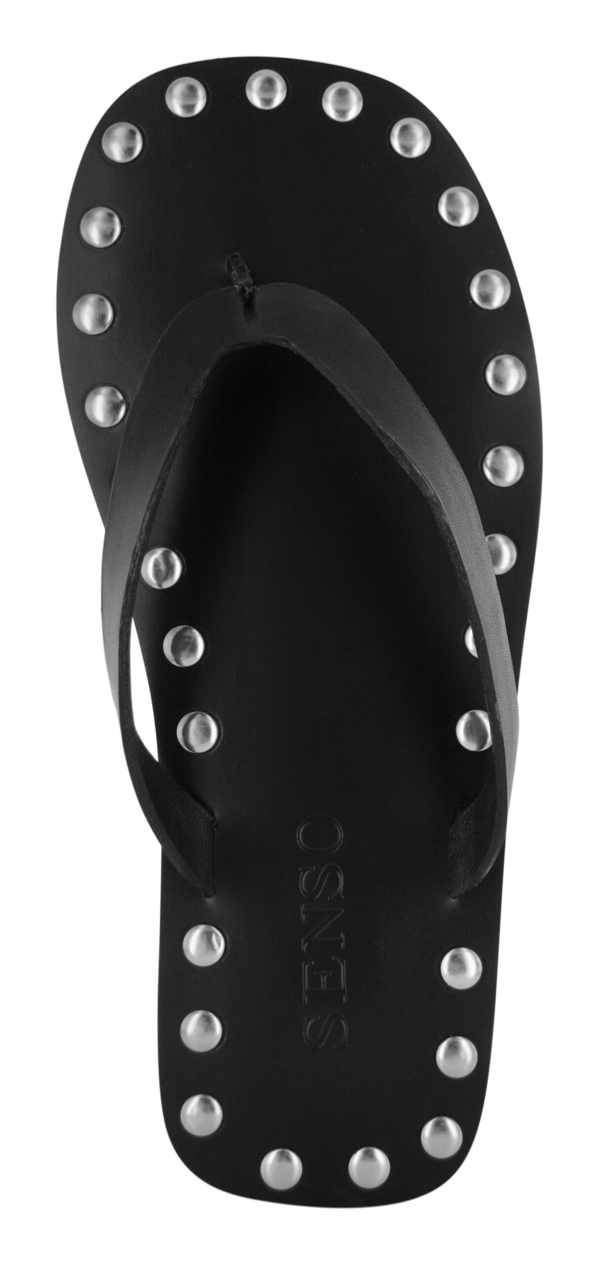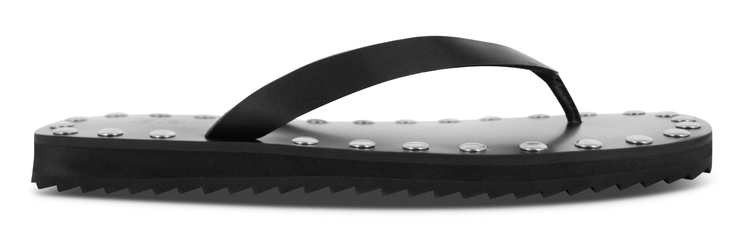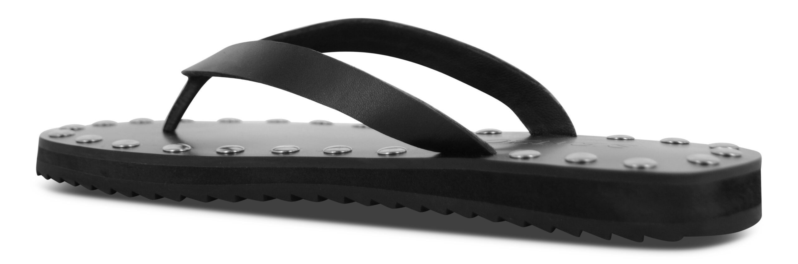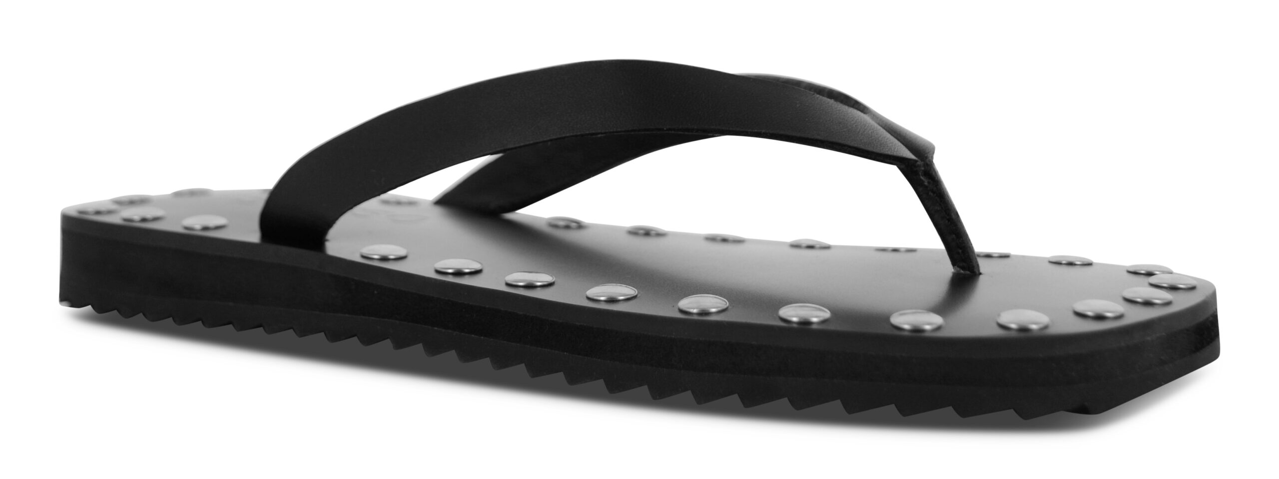 Ebony calf leather sandals with silver-tone stud embellishments, a light rubber sole, and a thong strap detail.