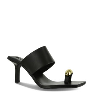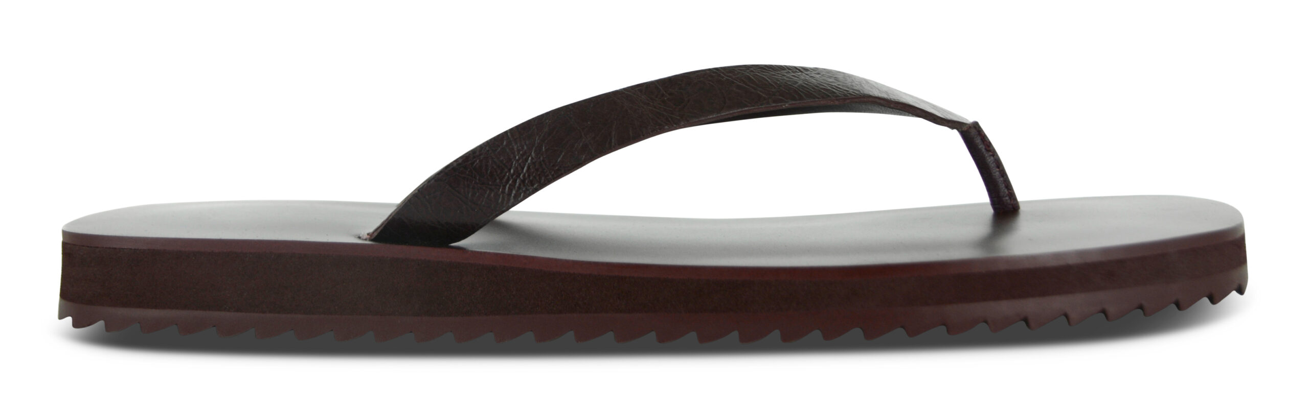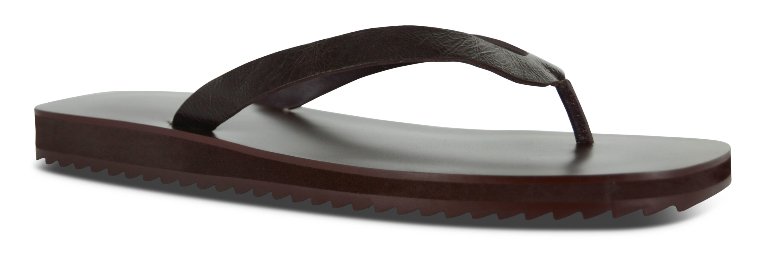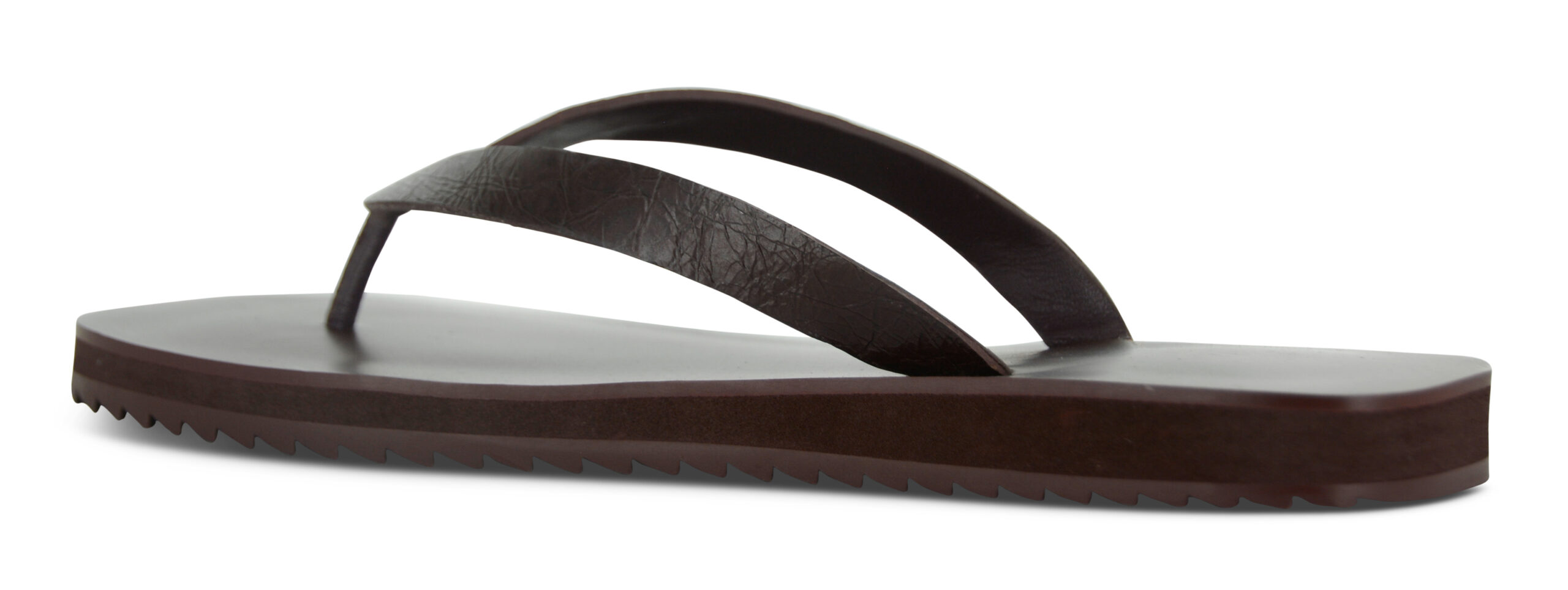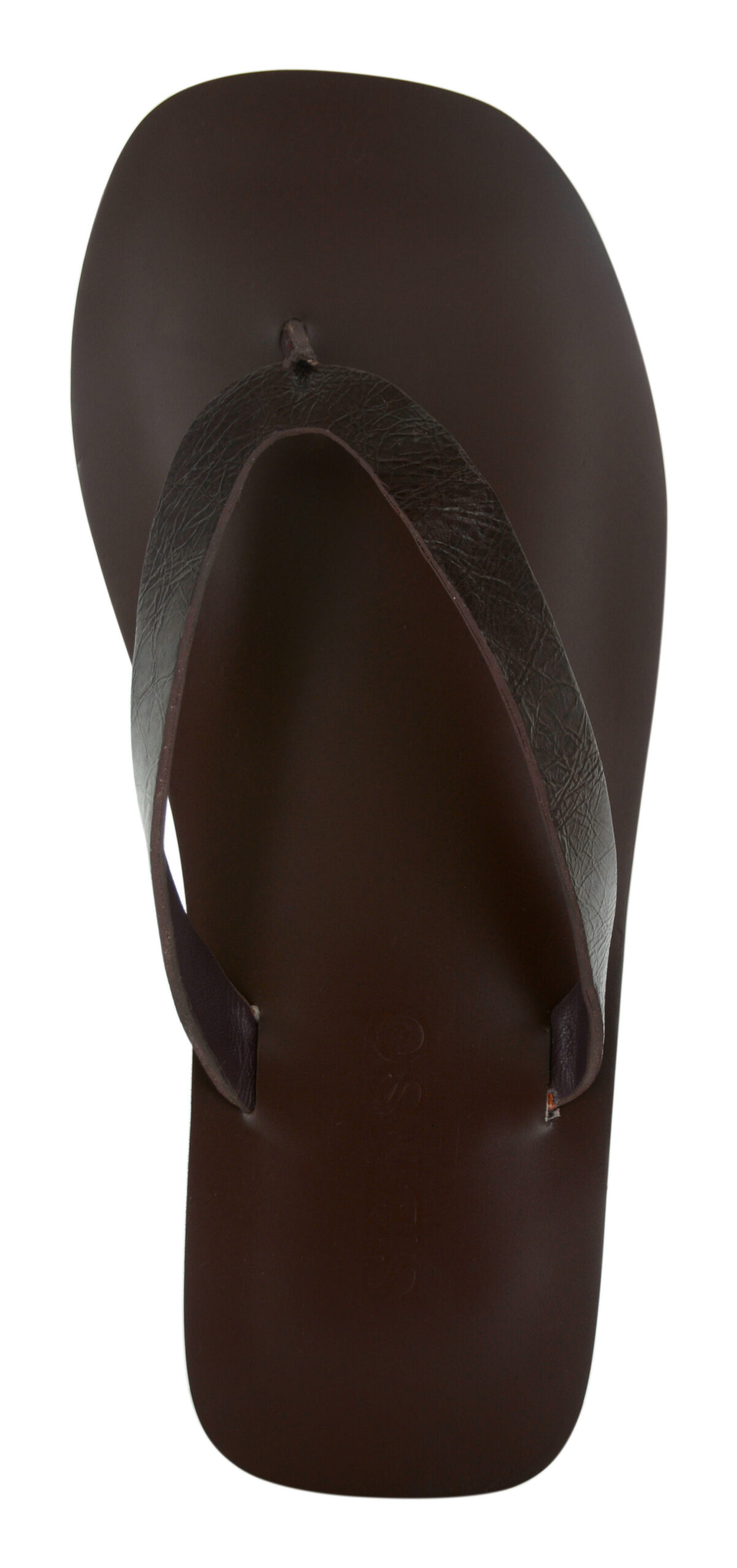 Espresso distressed kid leather sandals featuring a light rubber sole and a thong strap detail